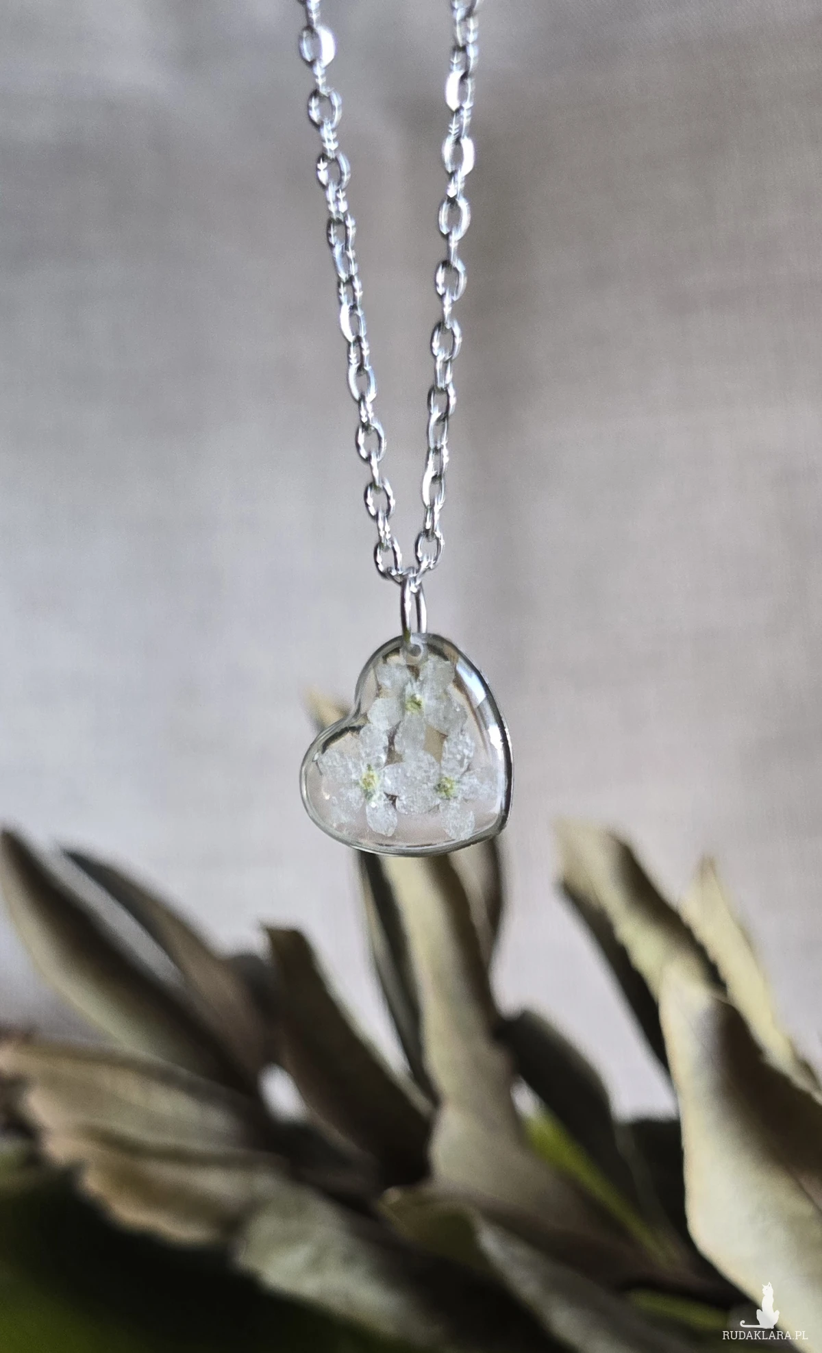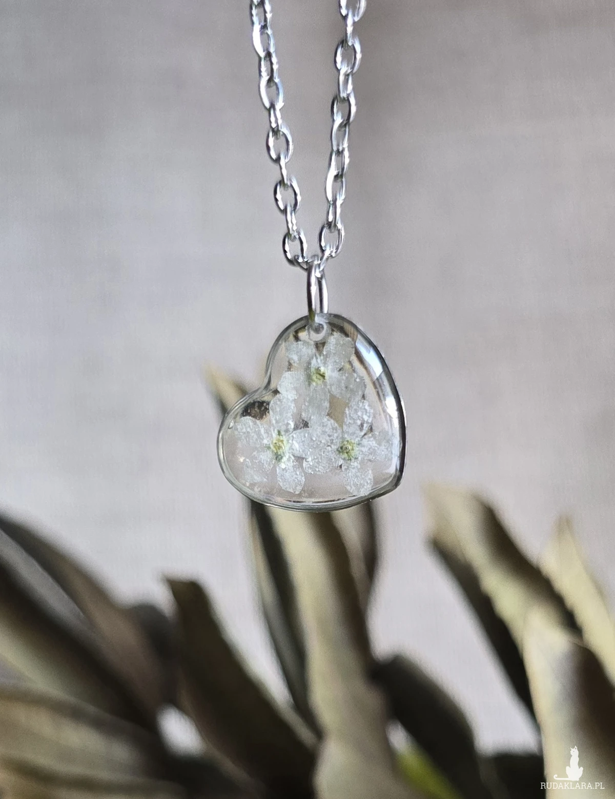 Srebrna zawieszka srebrny wisiorek kwiat naszyjnik żywica z żywicy kwiaty z kwiatami serce serduszko niezapominajki kwiatowy niezapominajki białe
