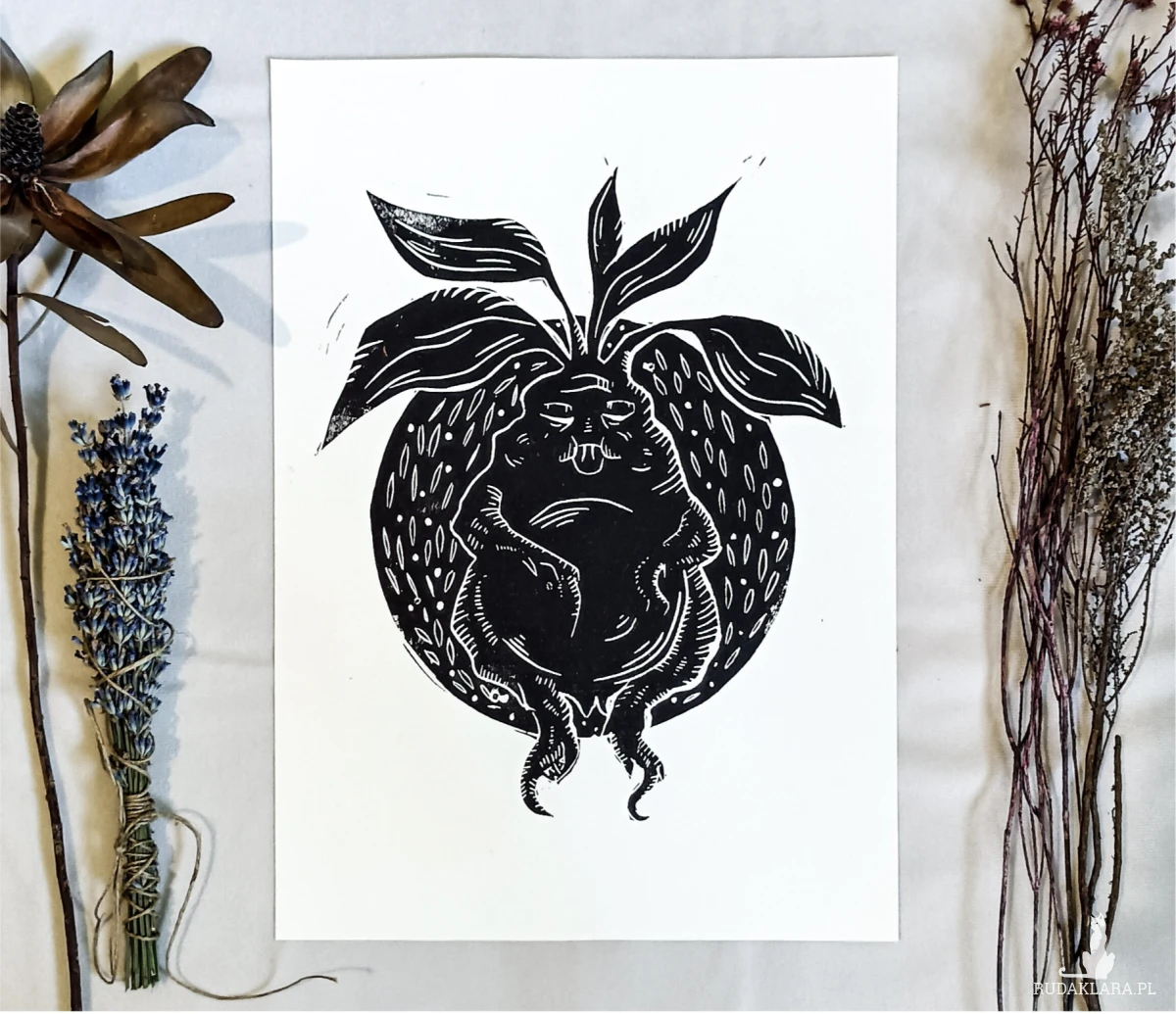 Ręcznie wykonany linoryt przedstawiający mandragorę – roślinę o tajemniczym i fantastycznym charakterze. Centralnym punktem grafiki jest mandragora, otoczona wyraźnym czarnym okręgiem, co nadaje kompozycji wyrazistej symboliki i harmonii.