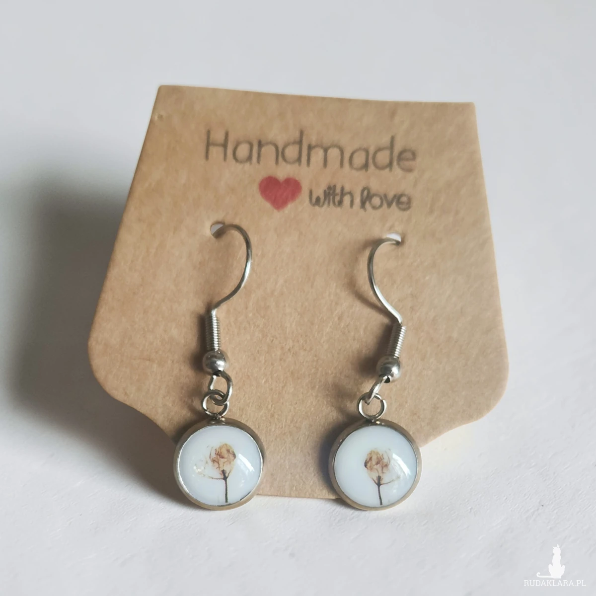 Kolczyki wiszące: Subtelne, okrągłe elementy z motywem drobnych kwiatuszków na białym tle.