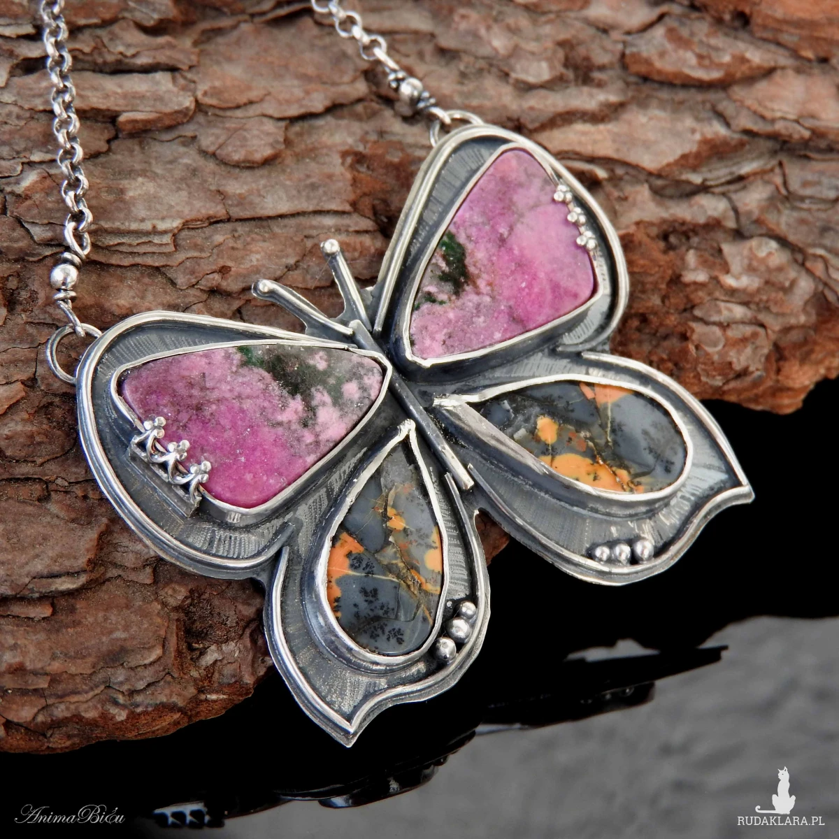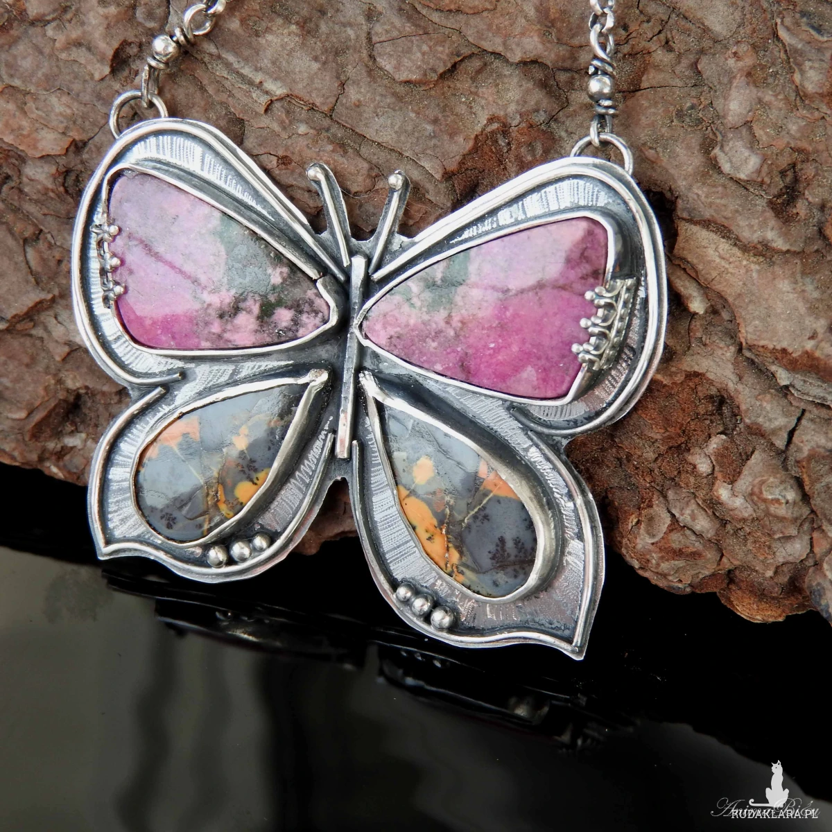 Naszyjnik srebrny motylek z kalcytem kobaltowym i jaspisem.