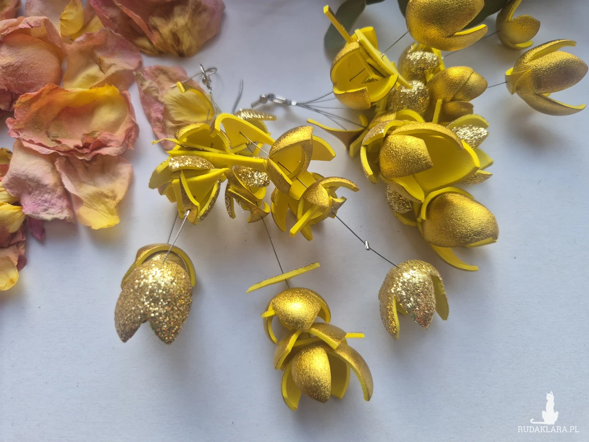 Kolczyki leciutkie kwiaty kolor złoty wykonane w pojedynczym egzemplarzu rękodzieło polecam