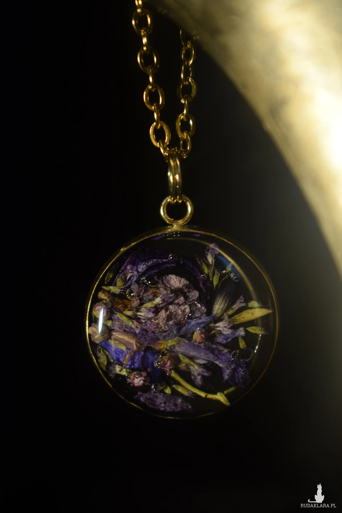 Hej, hej! Mamy tutaj wisior na czarnym tle z zatopionymi w żywicy kwiatami, które własnoręcznie zebrałam: mięty, lawendy, majowego bzu, leśnych dzwonków i pąkami sadźca dętego :) a wszystko na czarnym tle z dodatkiem złotej oprawy.