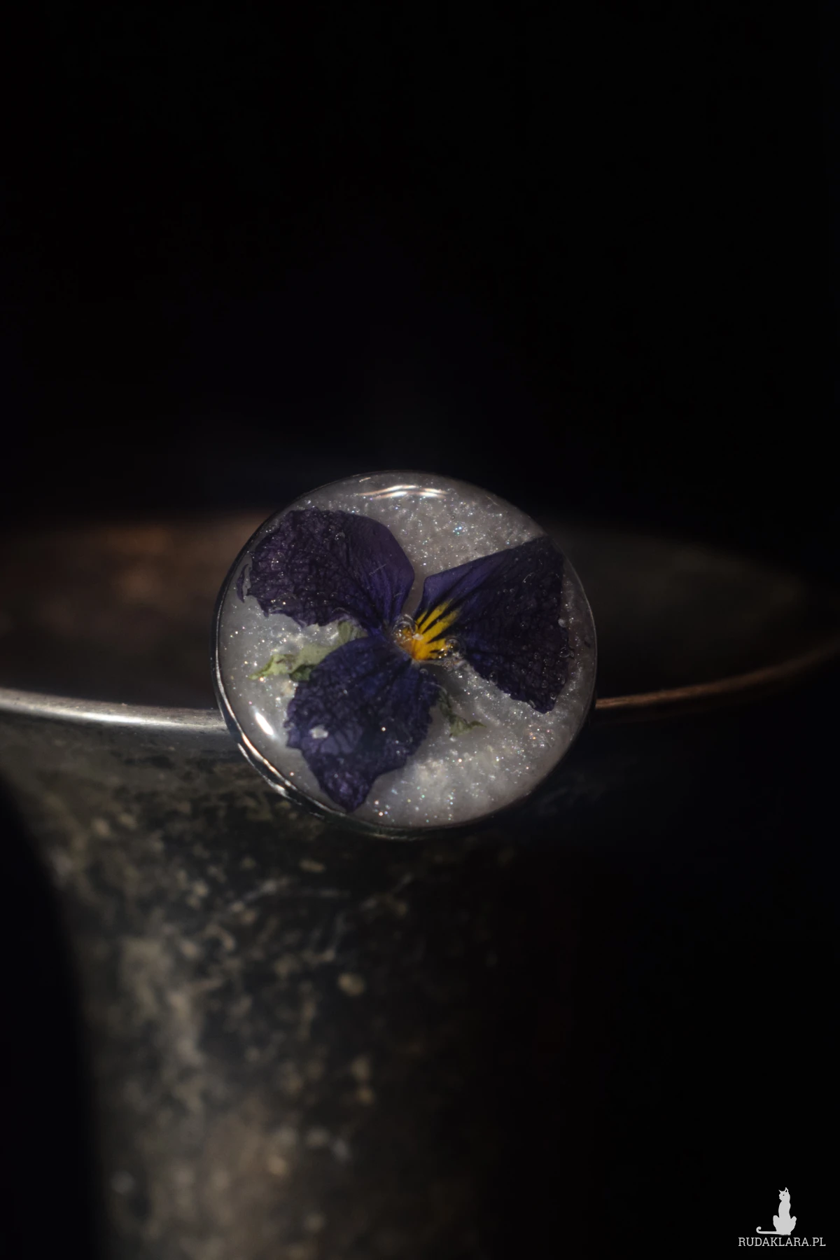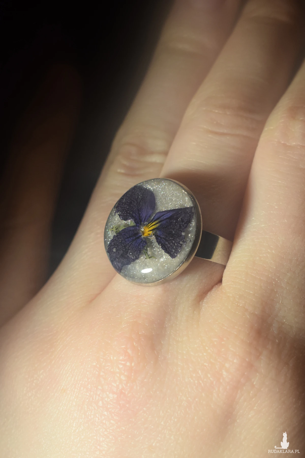 Cześć!! Tu Kasia z lucid.handmade :) prezentuje Ci pierścionek ze stali chirurgicznej, regulowany o początkowej średnicy 17mm (można go bardzo poszerzyć lub odrobinę zmniejszyć). W środku na perłowym tle, które delikatnie iskrzy pod wpływem słońca, został zatopiony polny bratek!