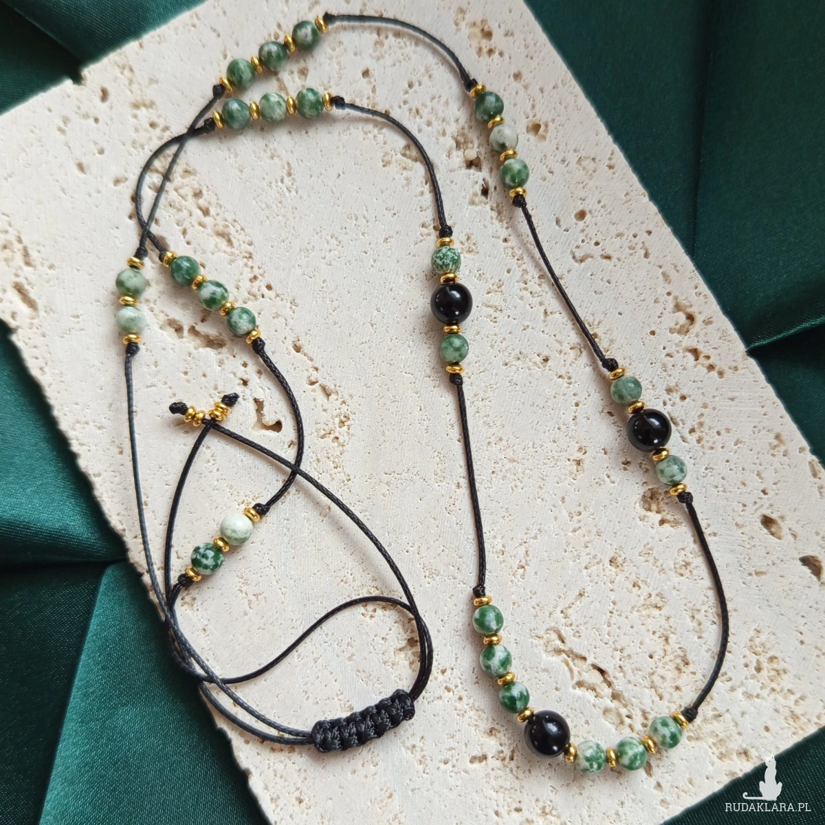 Naszyjnik "Roxi" - wykonany z kamieni naturalnych i mocnego sznurka jubilerskiego. Regulacja za pomocą plecionki makramowej. Długość całkowita 60 cm + 2x5 cm regulacji. Elegancki i niepowtarzalny, stworzony w pojedynczym egzemplarzu.