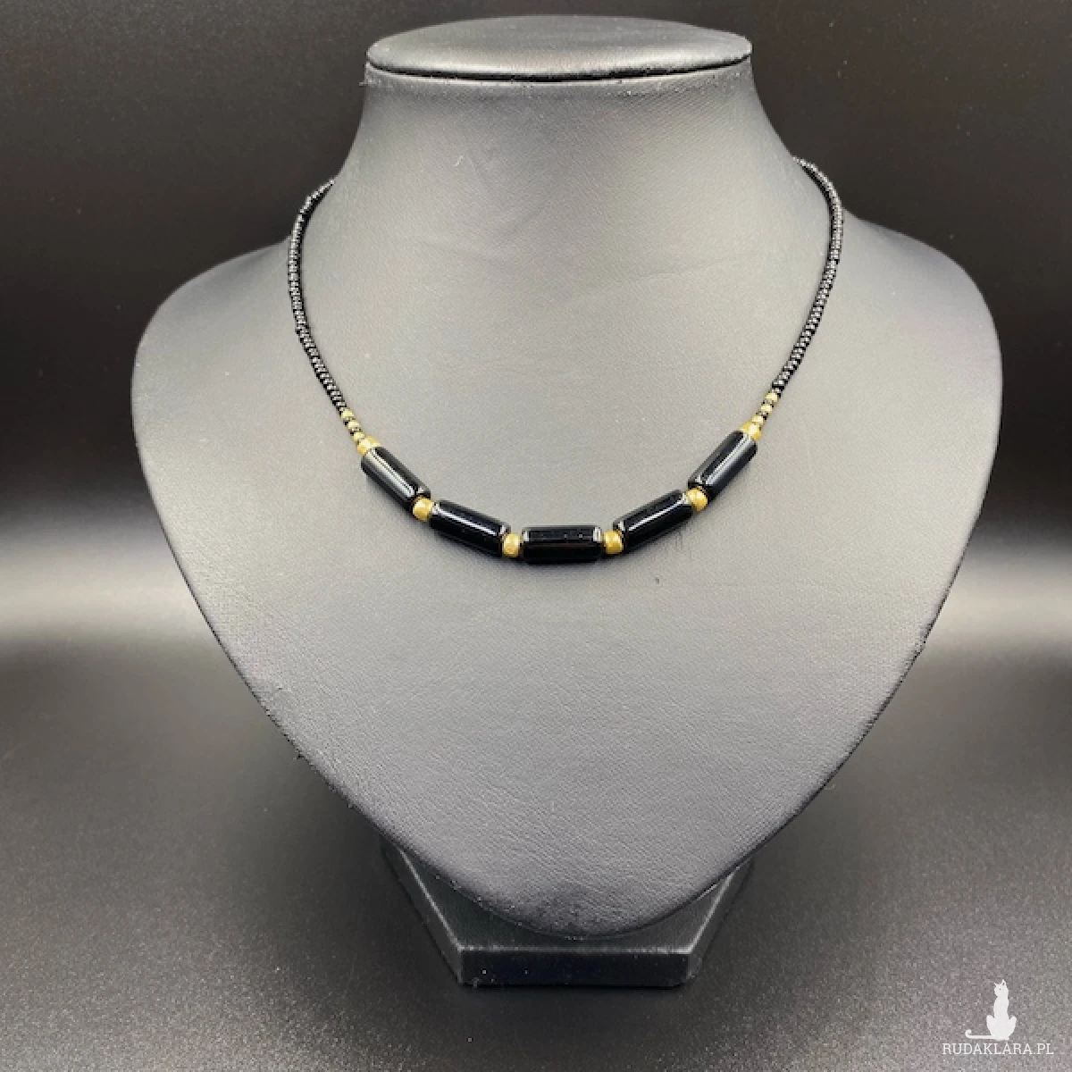 Krótki naszyjnik został wykonany ręcznie ze szklanych koralików w kolorze czarnym i złotym.