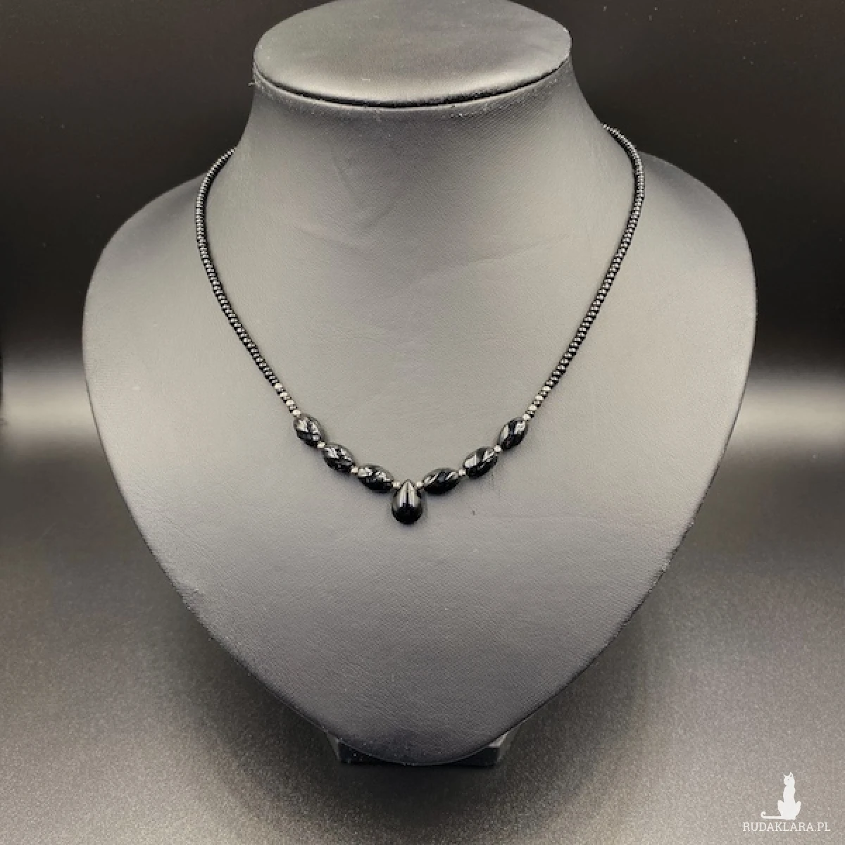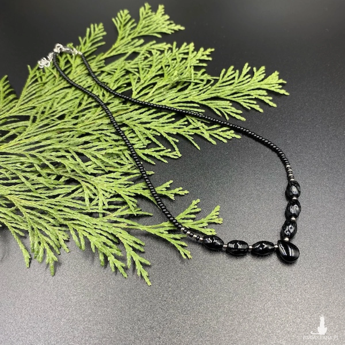 Krótki naszyjnik został wykonany ręcznie ze szklanych koralików w kolorze czarnym i srebrnym.