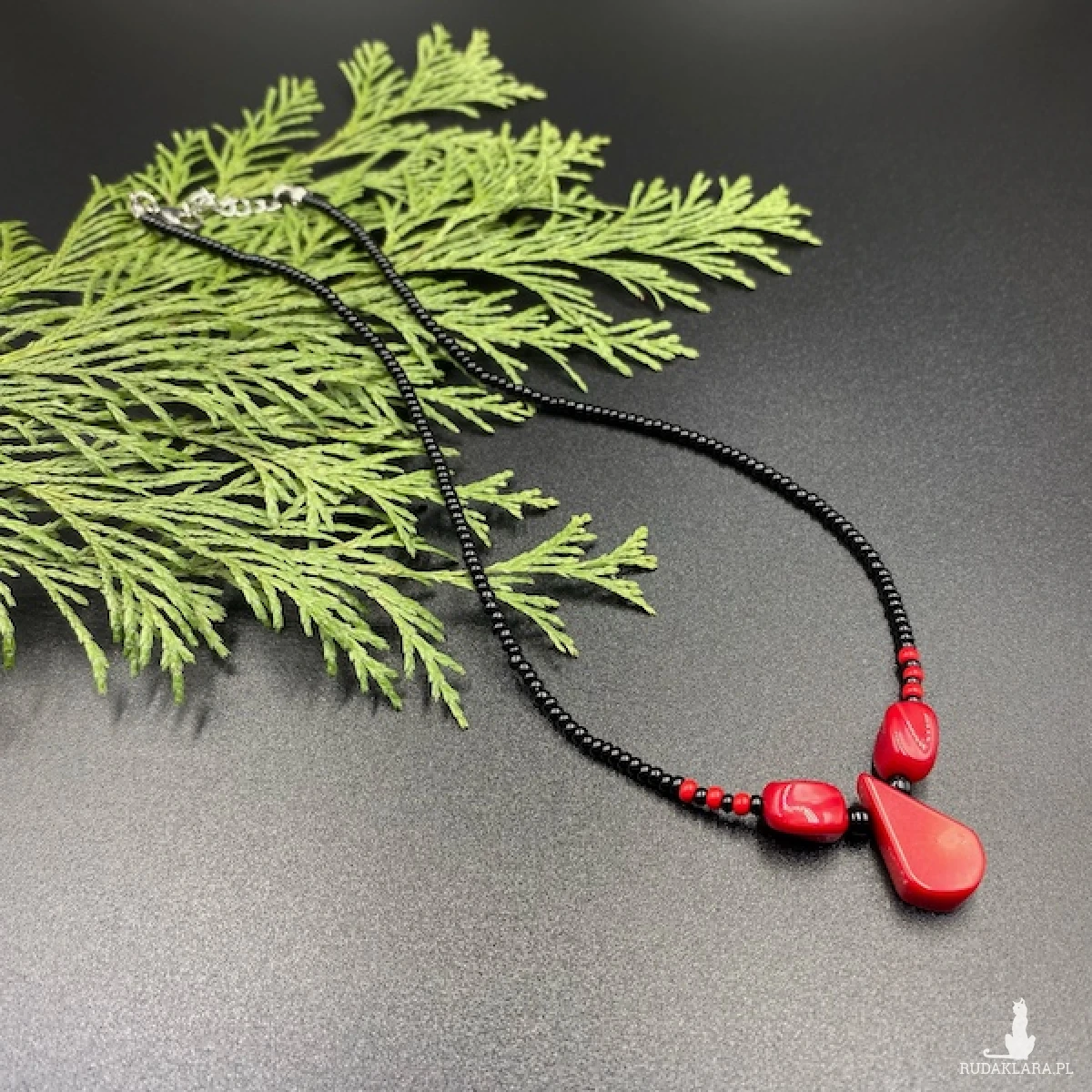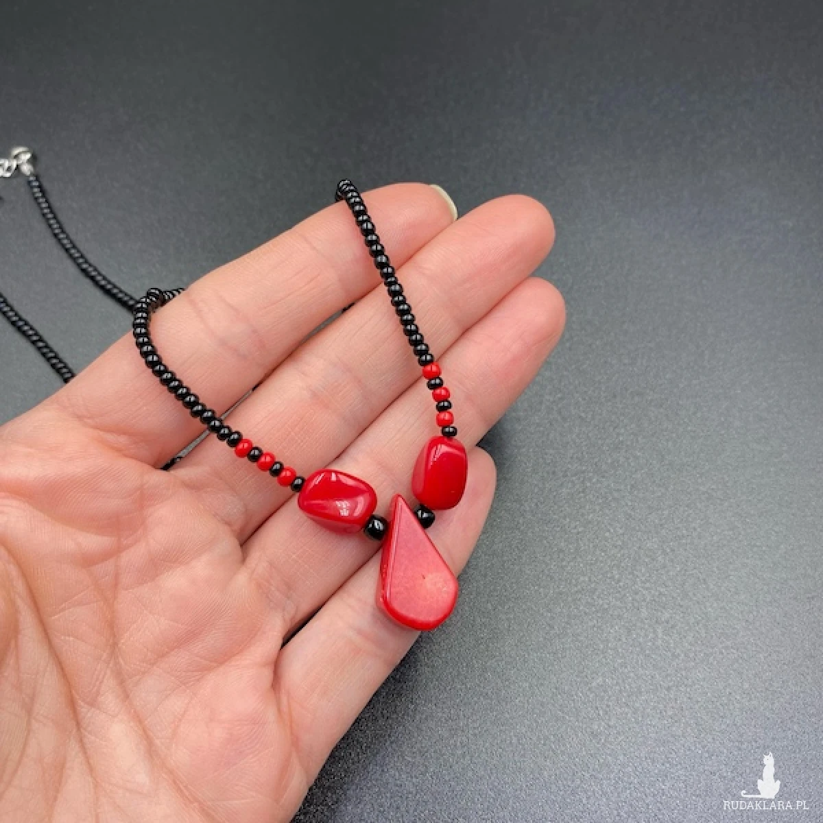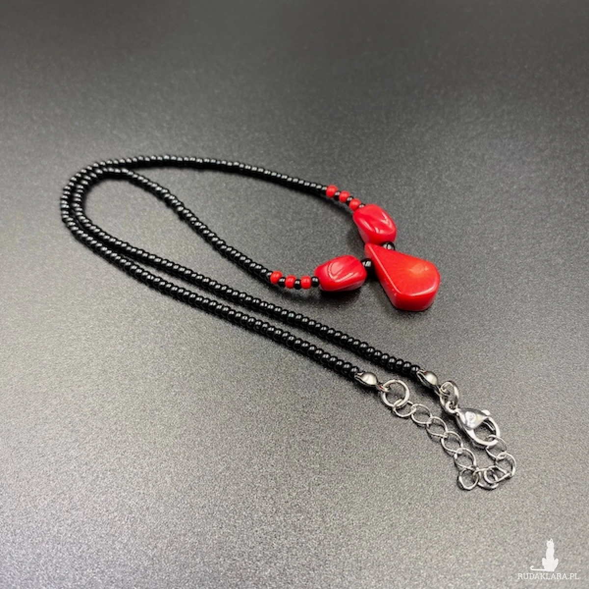 Krótki naszyjnik został wykonany ręcznie ze szklanych koralików i koralem czerwonym, w kolorze czarnym i czerwonym.