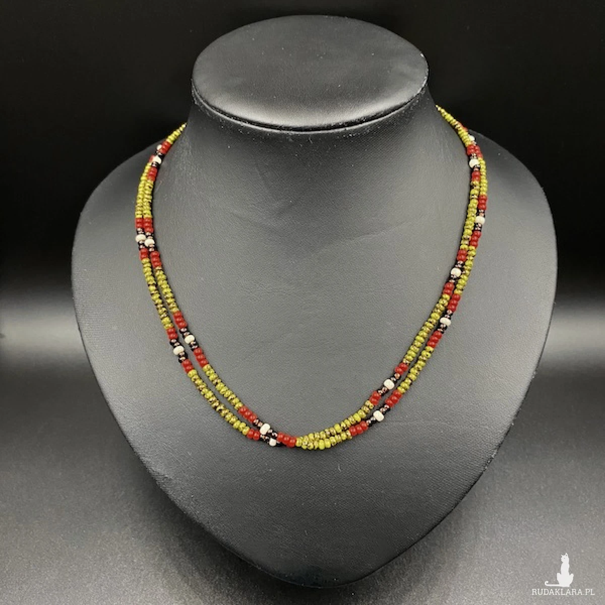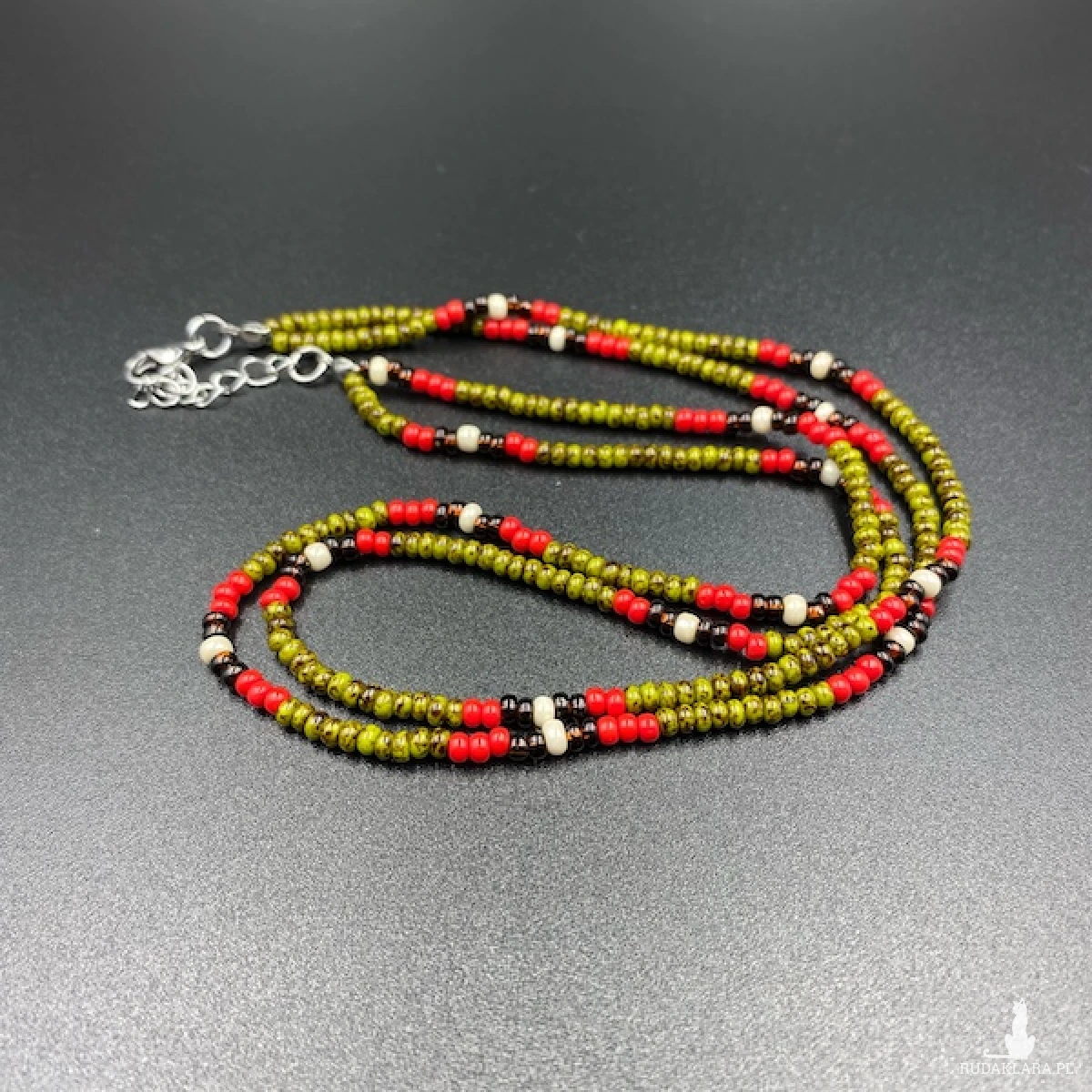 Krótki naszyjnik ( złożony z dwóch sznurów ) został wykonany ręcznie ze szklanych koralików w kolorze oliwkowej nakrapianej zieleni, czerwonym, bursztynowego brązu, kremowym.