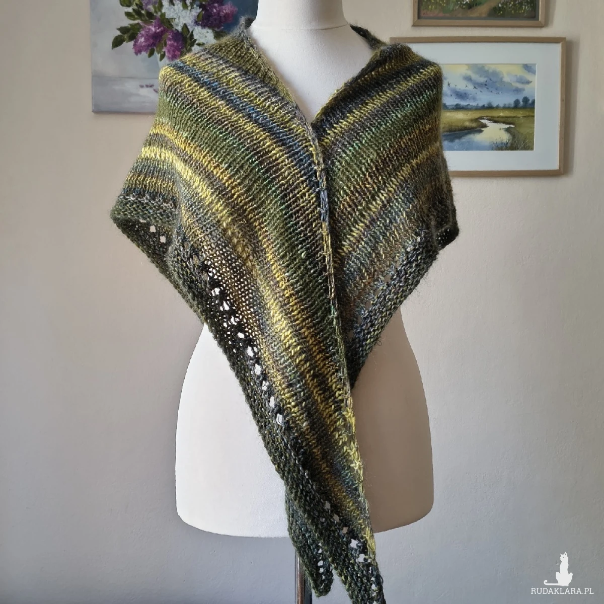 Duża, miła, delikatnie puchata, mięsista, lejąca chusta, wykonana ręcznie na drutach podwójną nitką z doskonałych włóczek (w tym wyjątkowej, kultowej włóczki japońskiej firmy Noro), kanadyjskiego, szlachetnego jedwabiu z moherem i wełenki 100% merino. Łączny skład włóczek to: jedwab, moher, wełenka merino, alpaka i minimalna ilość poliamidu. Niestety zdjęcia nie oddają piękna kolorów ich gradientów i uroku włóczek. Chusta jest twarzowa i pasuje do wielu stylizacji. Jest przy tym ciepła: doskonała do zimowego otulenia, jak i okrycia sylwetki w cieplejszych miesiącach. Wymiary: 215 cm. najdłuższy bok, 68 cm. wys. trójkąta. Pranie wyłącznie ręczne.