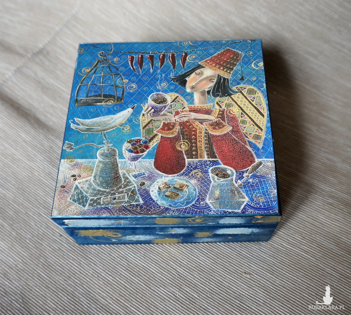 Drewniane pudełko decoupage z reprodukcją obrazu autorskiego, noszącego tytuł „Kawa po turecku”. Boki szkatułki pomalowane są ręcznie, a całość zabezpieczona jest bezbarwnym lakierem i sygnowana w środku.