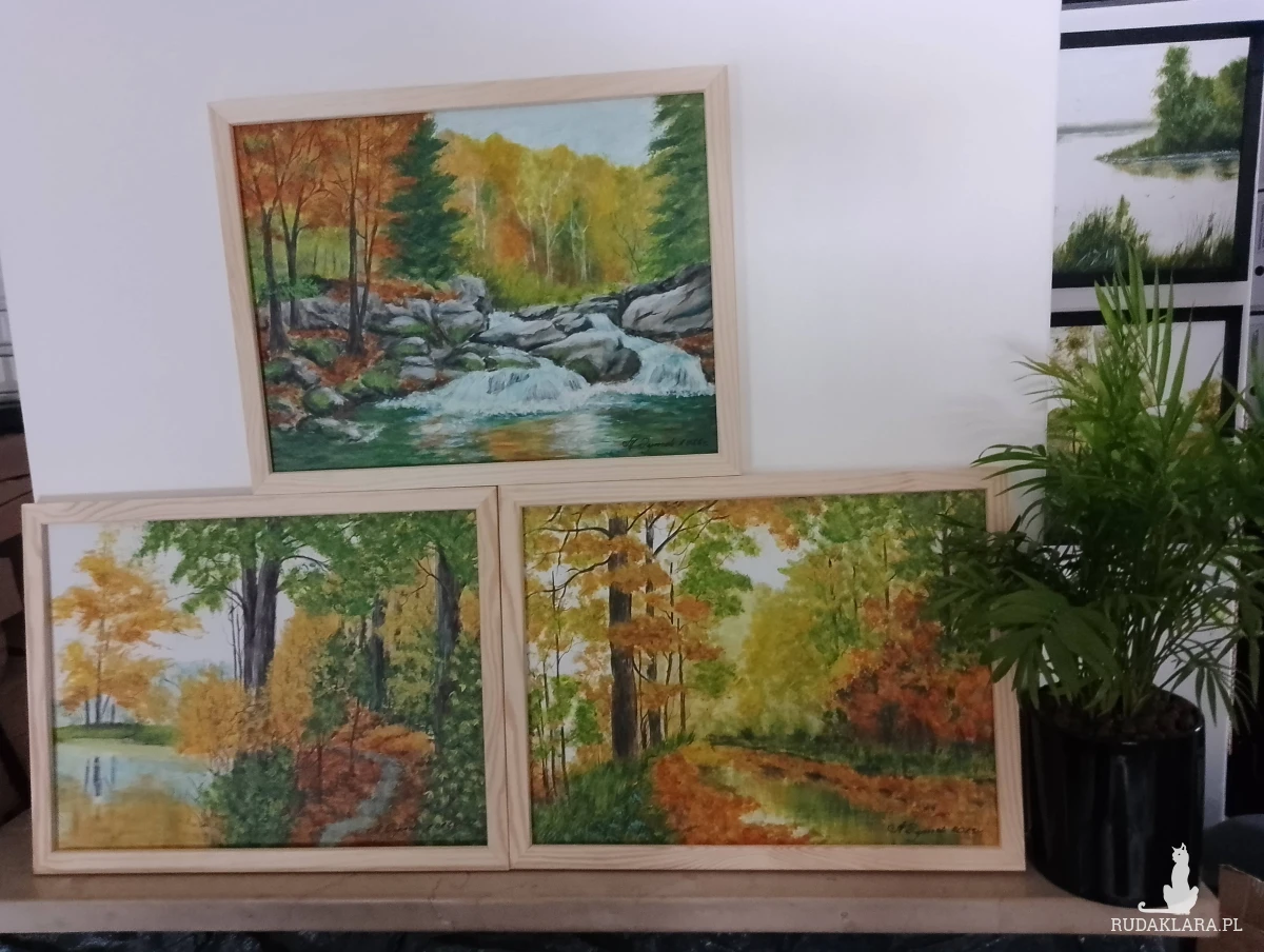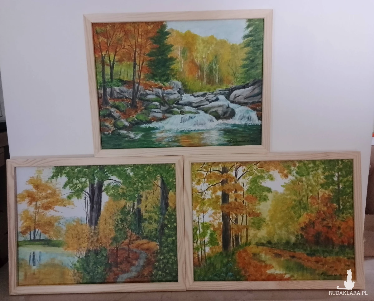 Jeden niepowtarzalny zestaw - TRYPTYK JESIENNY, w którym uchwycono piękno najbardziej barwnej pory roku. Obrazy tworzą spójną serię kolorystyczną, która przepięknie wypełni i udekoruje ściany salonu, sypialni, czy biura.