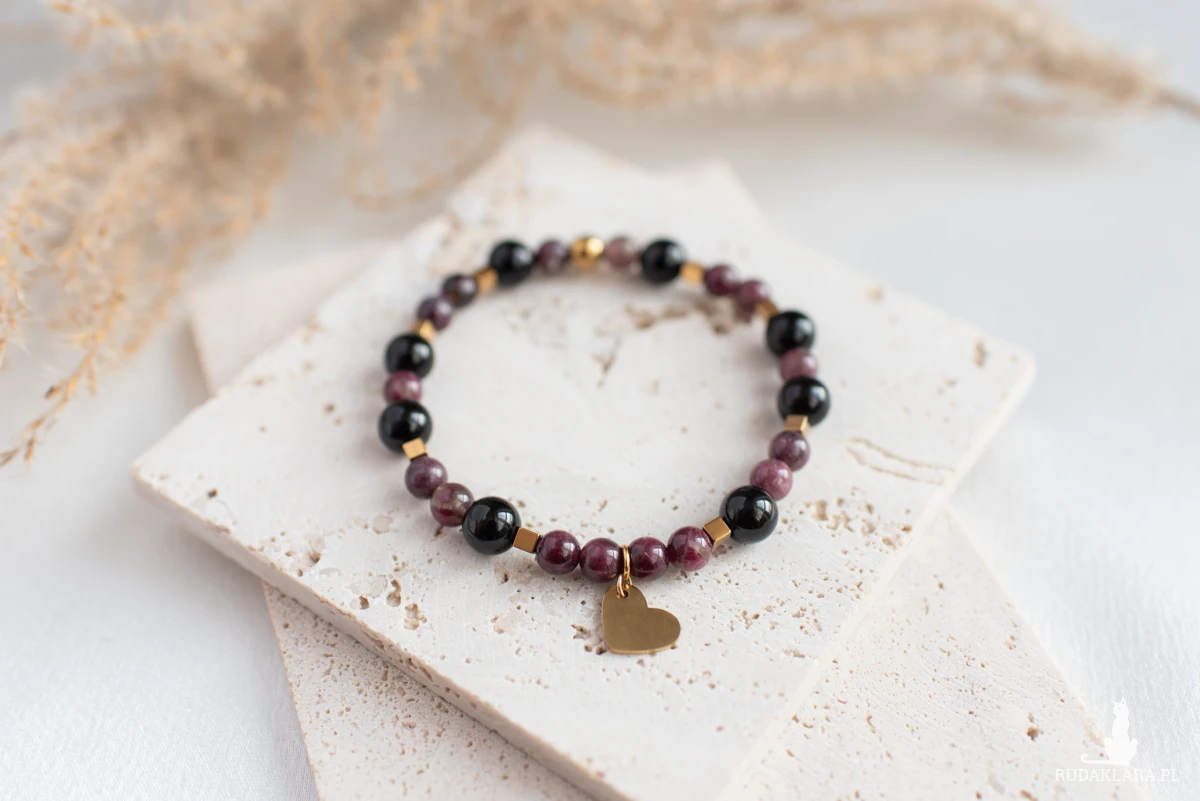 Amulet ochronny - bransoletka z turmalinu śliwkowego, onyksu oraz hematytu.