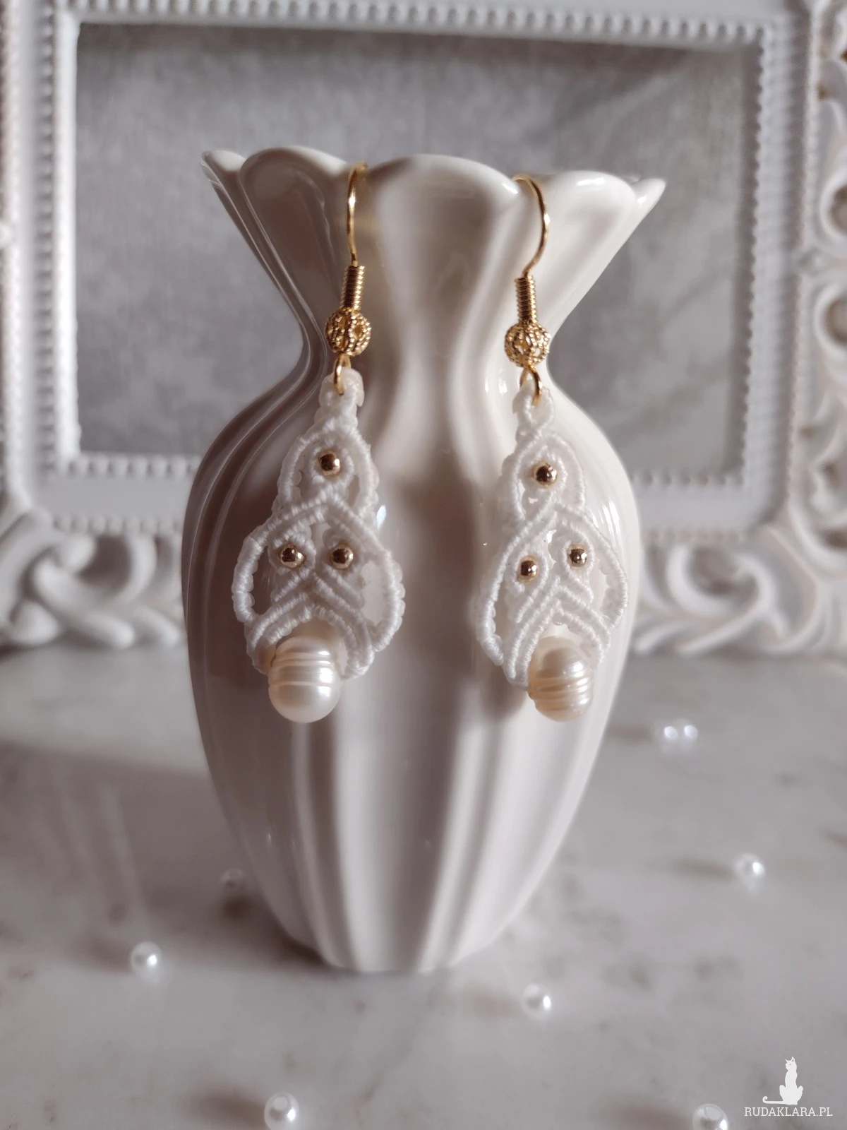 Delikatne kolczyki ręcznie wykonane w technice mikromakramy, oplecione subtelną białą nitką, z naturalną perłą na końcu. Osadzone na pozłacanych biglach, które dodają elegancji i komfortu noszenia.