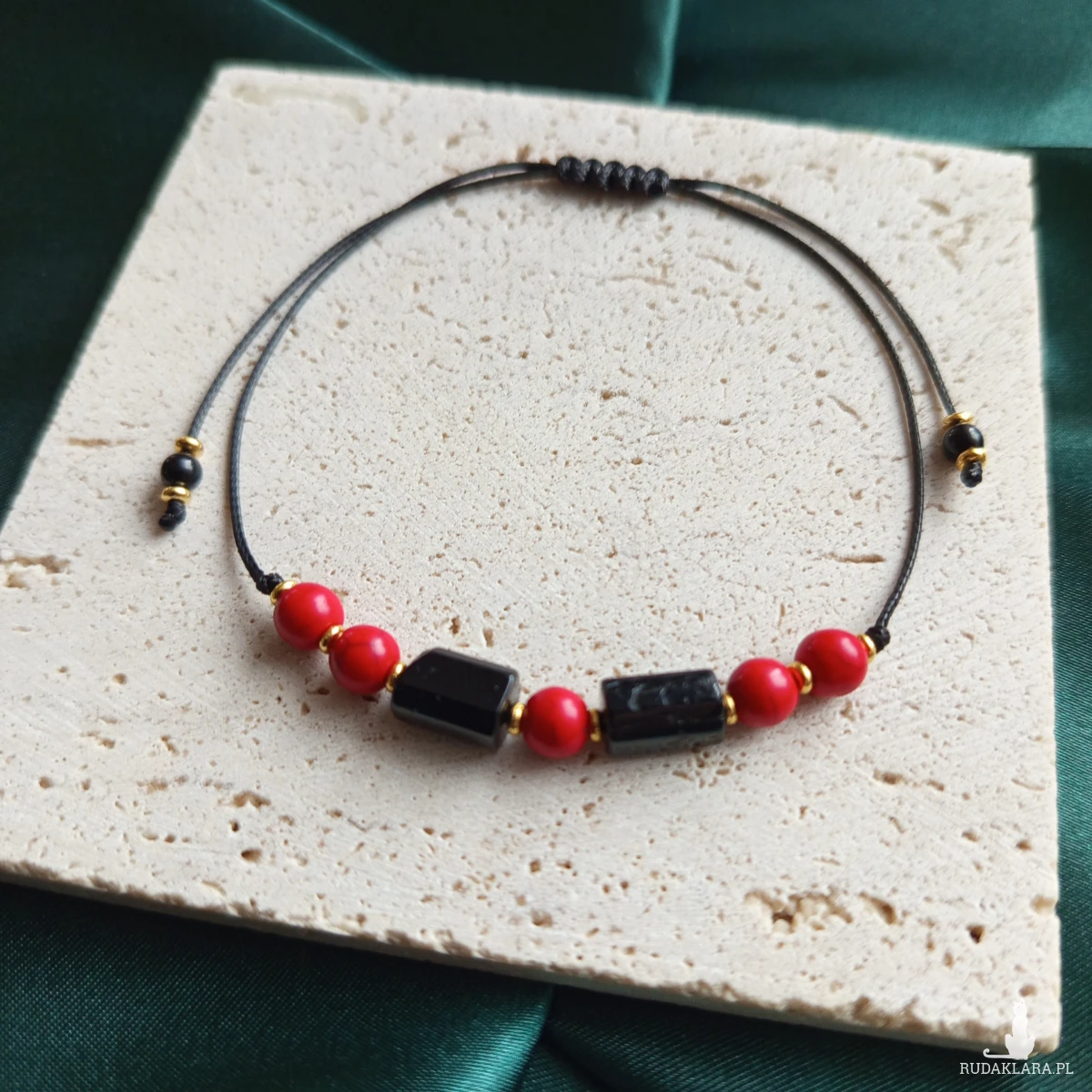 "Roma" - bransoletka wykonana z kamieni naturalnych i mocnego sznurka jubilerskiego. Regulacja za pomocą plecionki makramowej. Wyrazista dzięki połączeniu głębokiej czerni i radosnej czerwieni - klasyk, który nigdy nie wychodzi z mody.