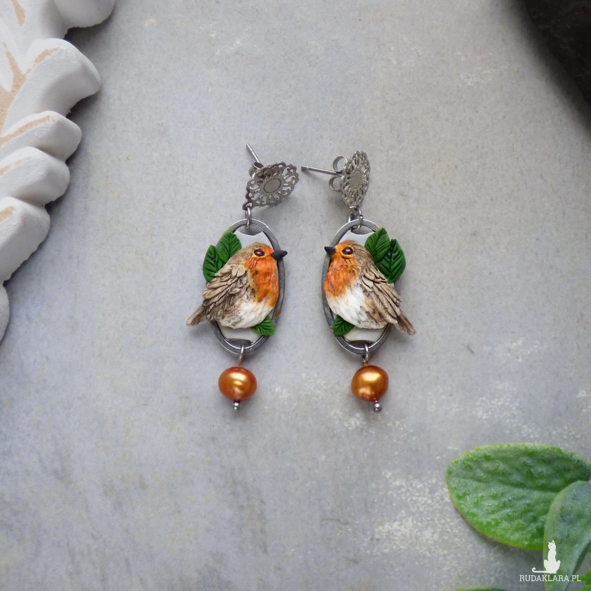 Kolczyki „Rudzik z perłą” to miniaturowe, ręcznie wykonane ptaszki z glinki polimerowej, z dopracowanymi piórkami i ciepłą, rudą piersią oraz oczkami z kulek granatu. Kompozycję otulają zielone listki, a na dole delikatnie kołysze się perła słodkowodna w kolorze miedzi – jak kropelka wschodzącego słońca.