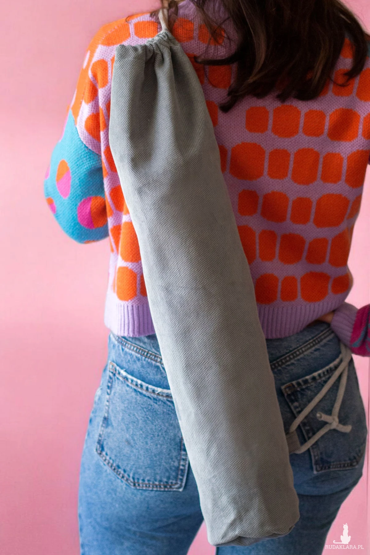 Plecak worek wykonany z szarej tkaniny o ciekawym tłoczeniu. Jego kształt sprawia, iż idealnie nadaje się na pokrowiec na matę do jogi.