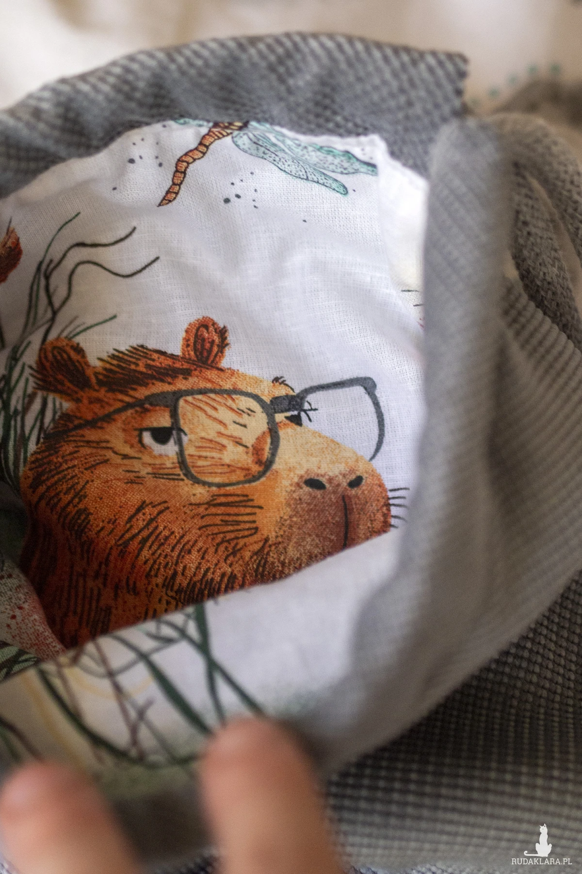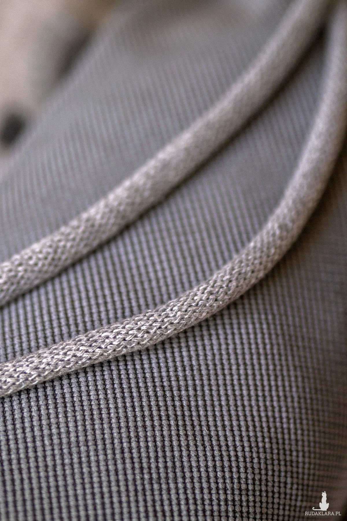 Biała, bawełniana podszewka w kapibary, okrągłe dno. Całości dopełnia gruby, bawełniany sznurek w kolorze jasnoszarym.