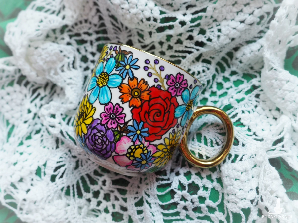 Wzór wykonany został przy użyciu nietoksycznych farb do porcelany, jest wodoodporny - naczynie może być myte ręcznie, bez użycia ostrych narzędzi.