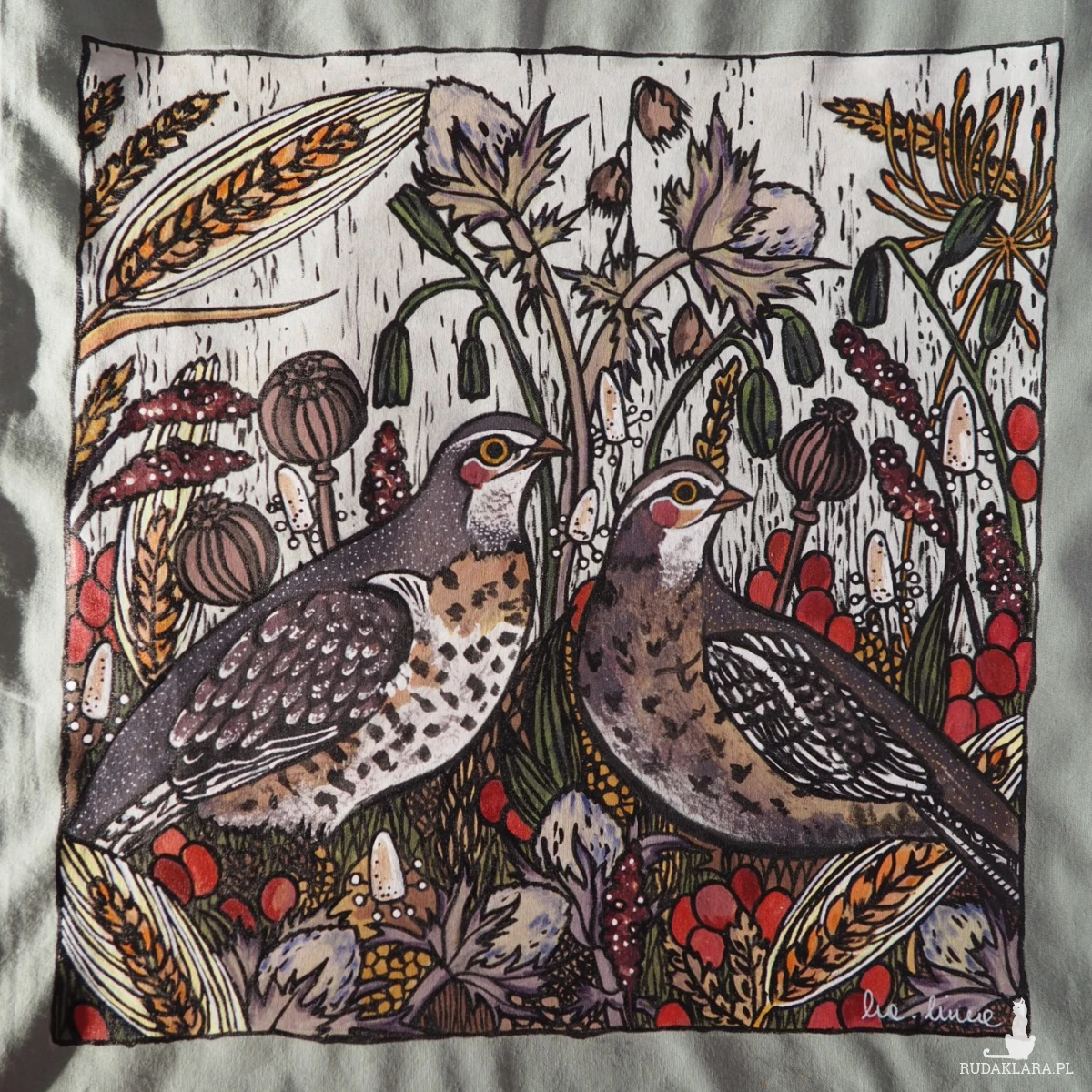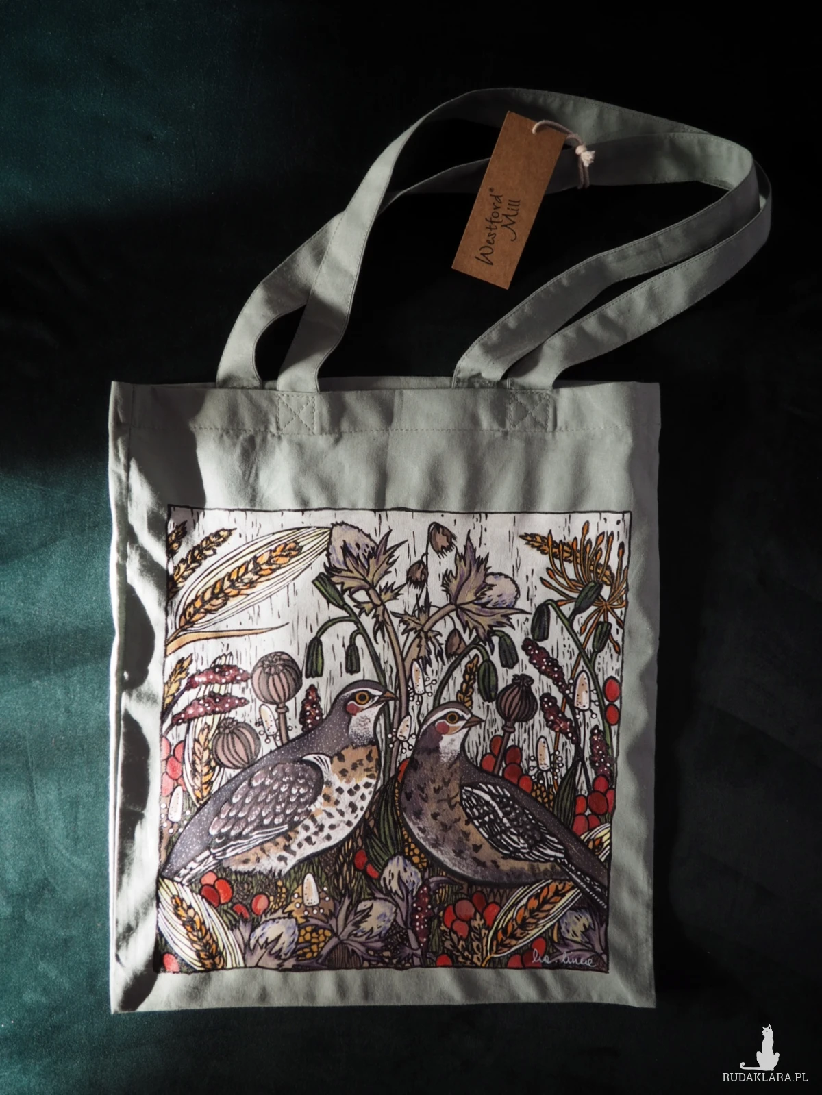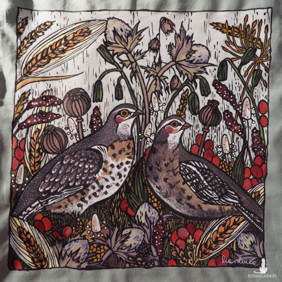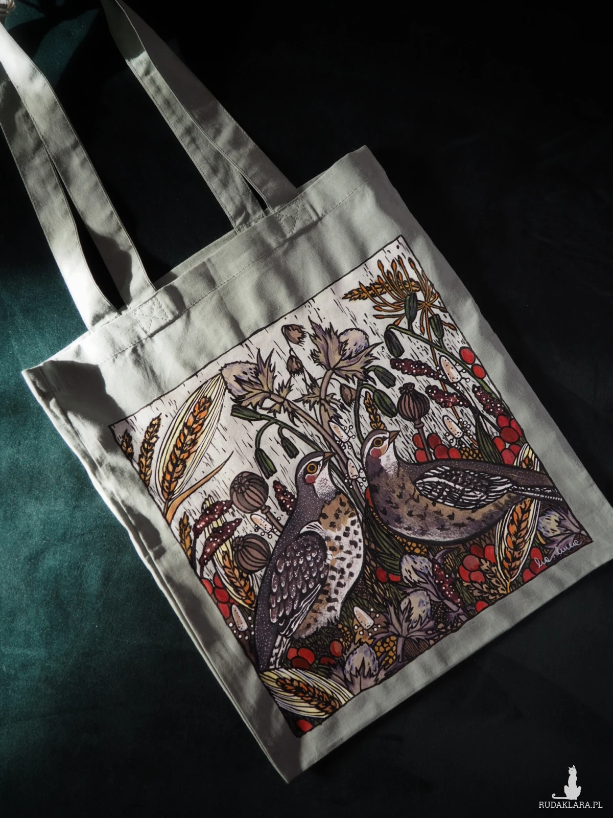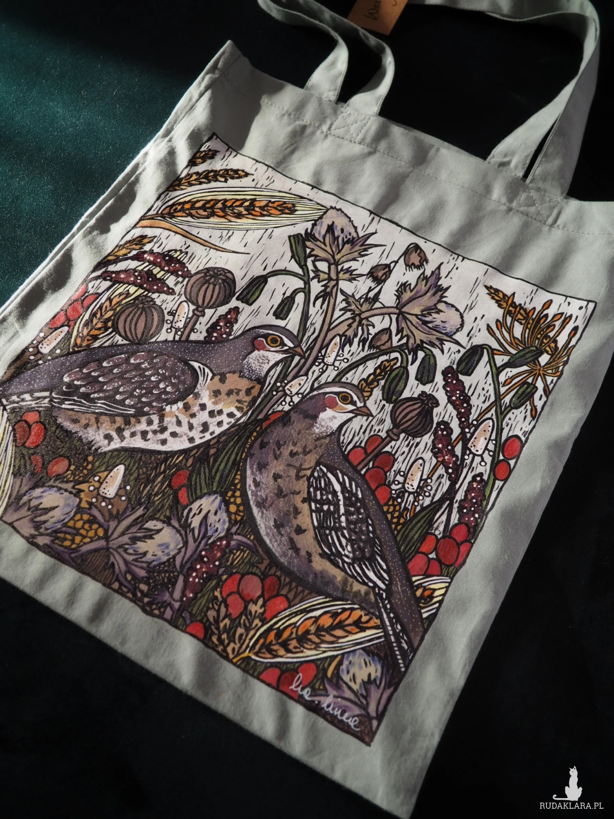Ręcznie malowana bawełniana torba zakupowa z wzorem kuropatw na polu. Będzie doskonałym uzupełnieniem stroju lub prezentem imieninowym, urodzinowym, gwiazdkowym itp. dla osoby ceniącej rękodzieło. Torba będzie idealna do pracy, na spacer po mieście, do szkoły - zmieści teczkę z dokumentami, drugie śniadanie, wodę, telefon, portfel itd. Ciekawy wzór przyciągnie spojrzenia wokół. Sprawdzi się zarówno na co dzień, jak i na wakacyjny wyjazd. Wzór na torbie jest trwały i wodoodporny - torbę można wyprać ręcznie w temp. do 30 stopni (nie wykręcać, nie wirować - powiesić z wodą do odcieknięcia. Można prasować po lewej stronie).