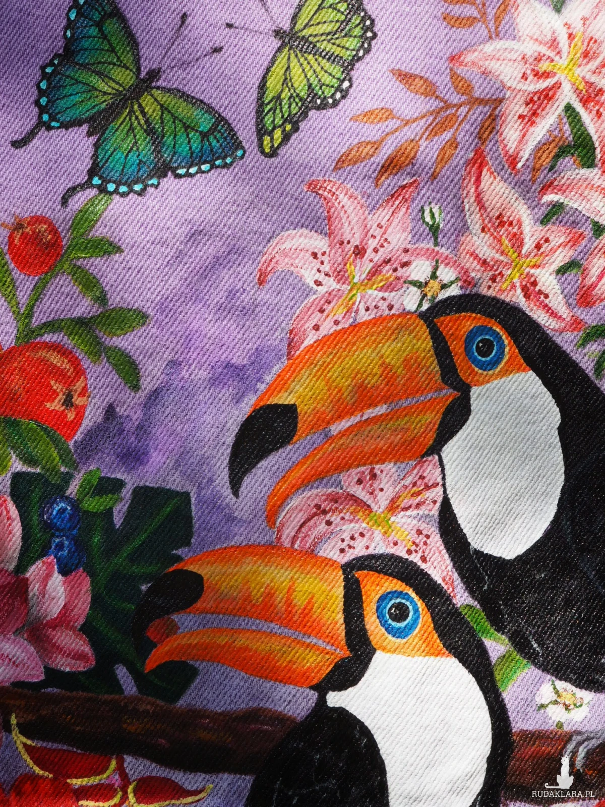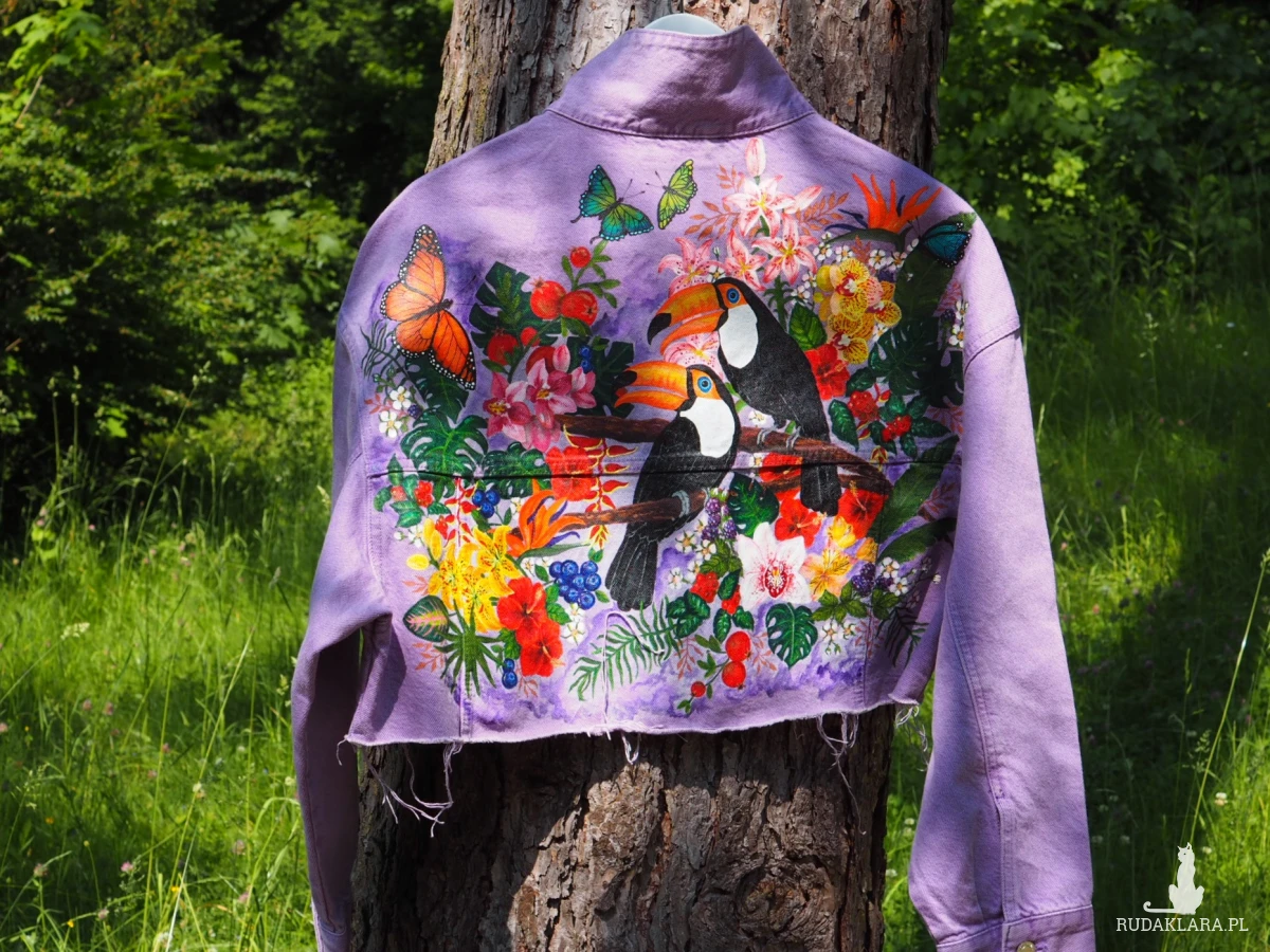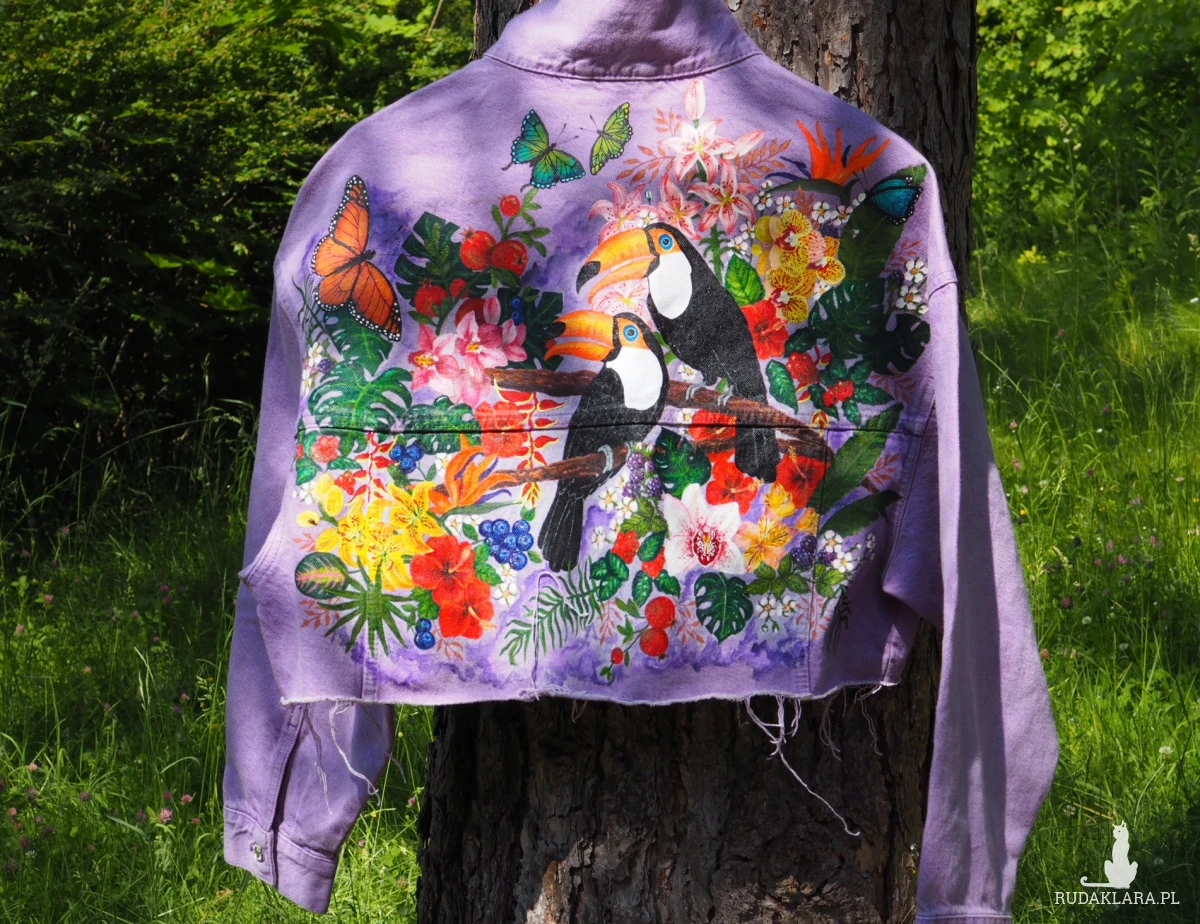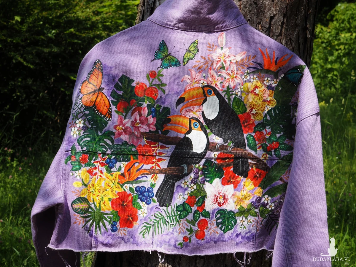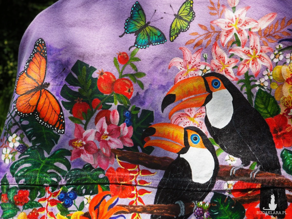 Ta oszałamiająco kolorowa, ręcznie malowana (nie drukowana) kurtka w tukany, motyle i tropikalne kwiaty to idealny prezent dla każdej bliskiej osoby. Jeżeli kochasz naturę i wibrujące kolory, ubierz się w ten egzotyczny, jedyny w swoim rodzaju wzór.