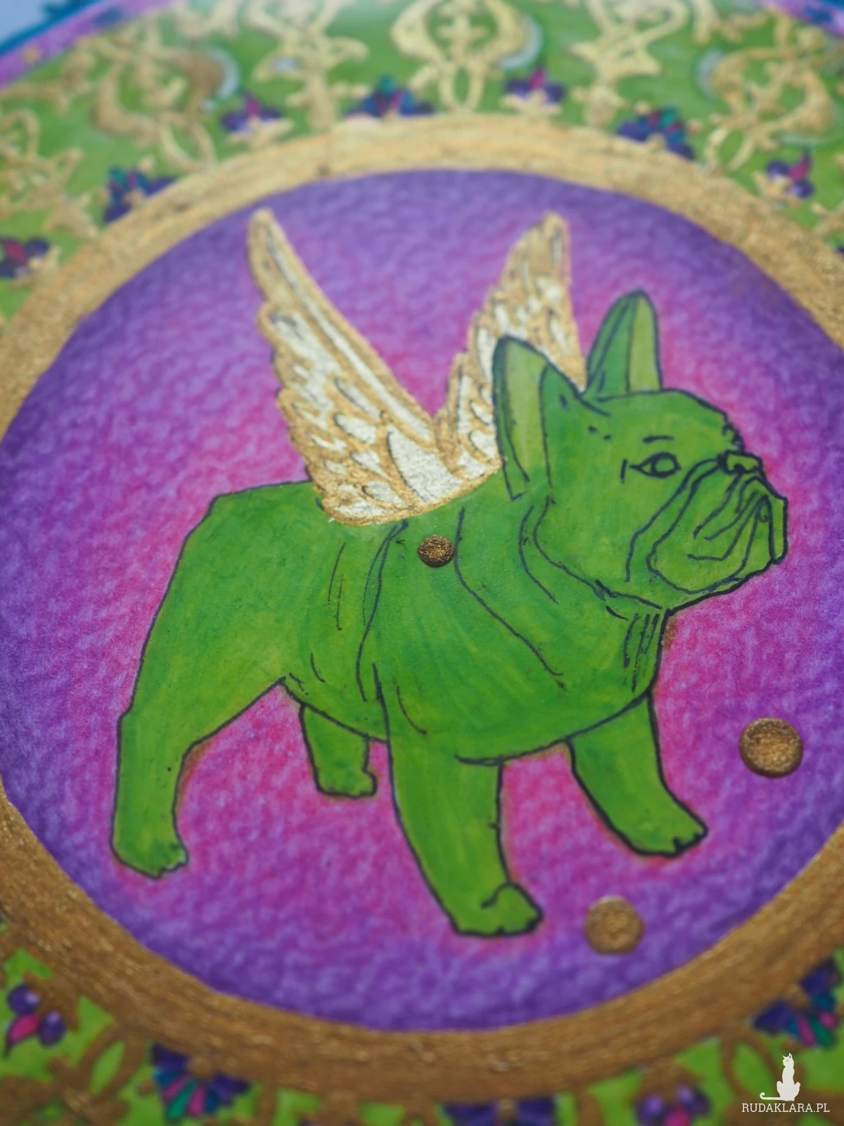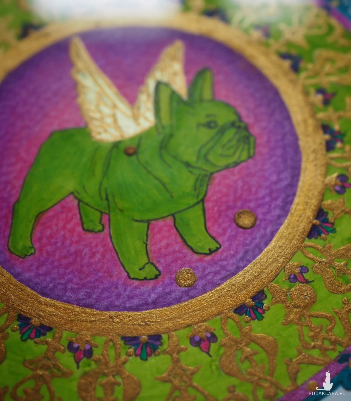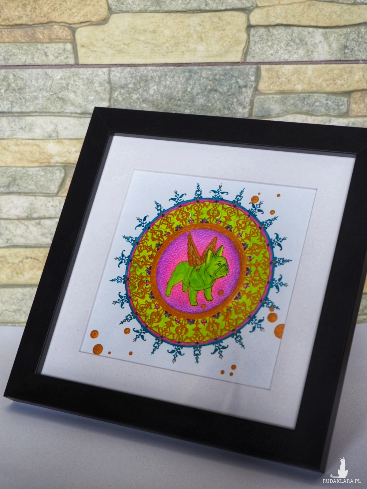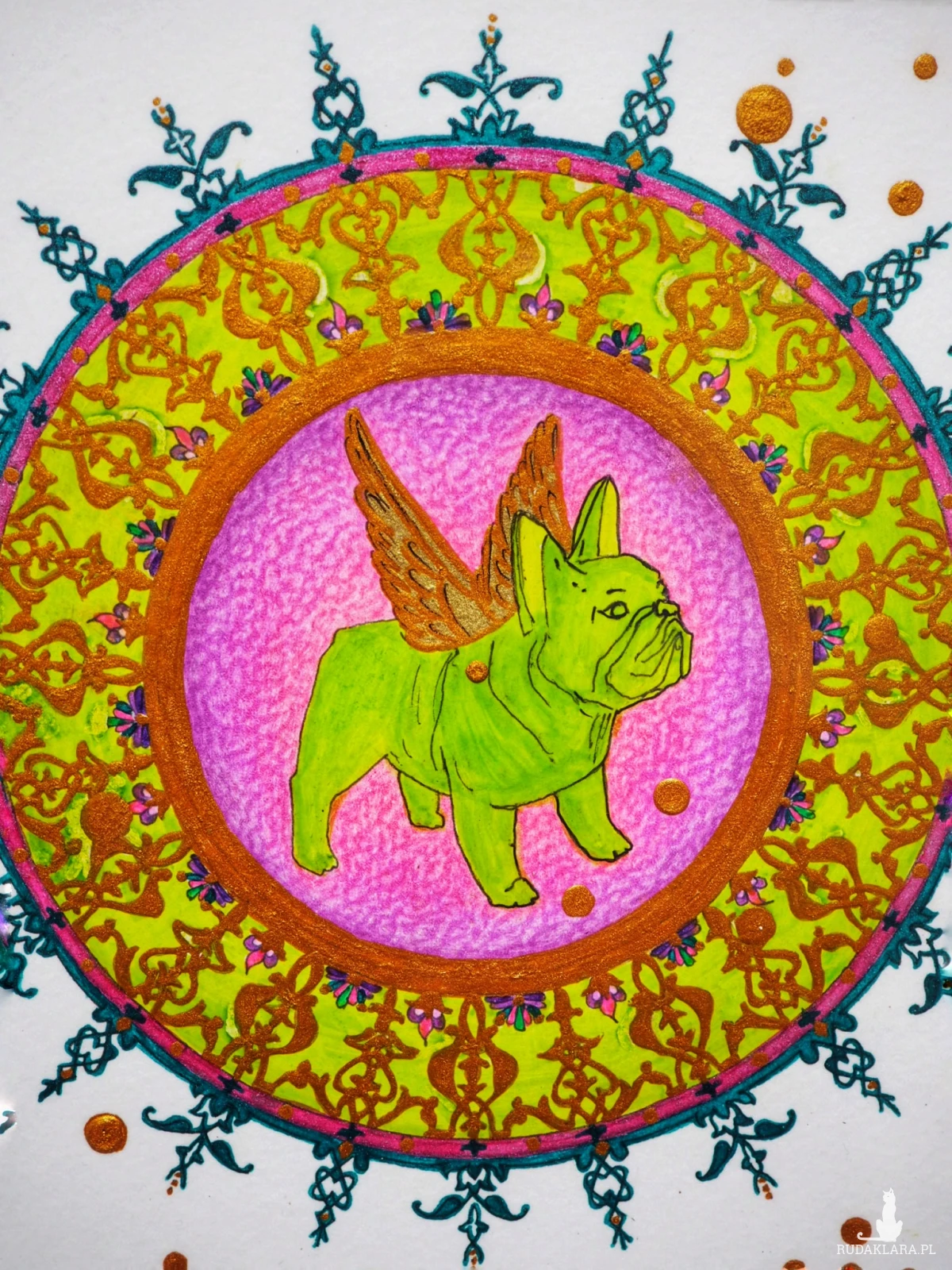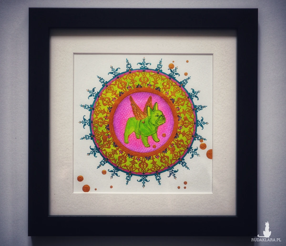 Zabawna mandala, inspirowana sztuką wschodnią, ze skrzydlatym zielonym mopsem otoczonym misterną kompozycją orientalnych ornamentów. Wibrujące fluorescencyjne barwy podkreślają absurdalność zestawienia tematu z formą. Taki obraz sprawdzi się jako upominek na niemal każdą mniej formalną okazję. Może stać się dekoracją salonu, sypialni, biura, a nawet kuchni czy przedpokoju.