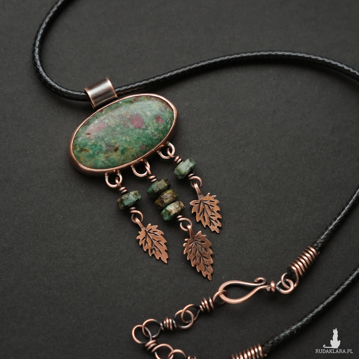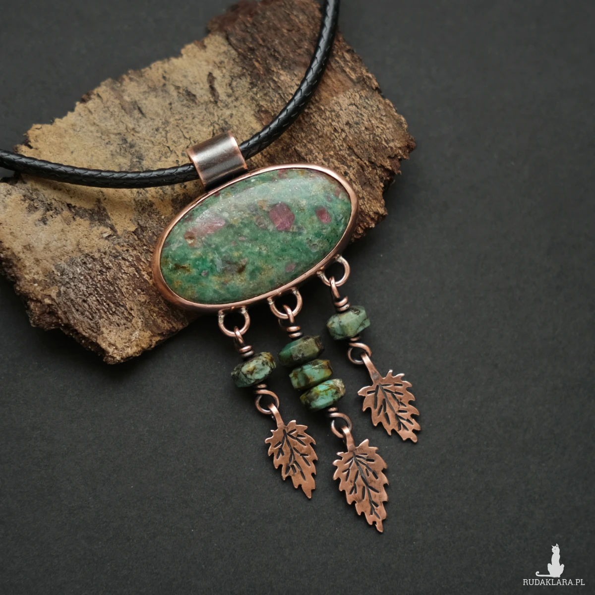Unikatowy miedziany wisior z rubinem w fuchsycie. Ozdobiony maleńkimi liśćmi pokrzywy wyciętymi z miedzianej blachy (te pokrzywy nie kłują!) oraz kamieniami turkusu afrykańskiego. Wszystkie elementy zostały stworzone ręcznie na podstawie rysunku, co nadaje mu oryginalnego charakteru. Wisior ma naniesioną miejscowo patynę, aby uwydatnić żyłki liści. Idealnie sprawdzi się na dekolcie miłośniczki natury oraz ziół, ceniącej wyroby rękodzielnicze.