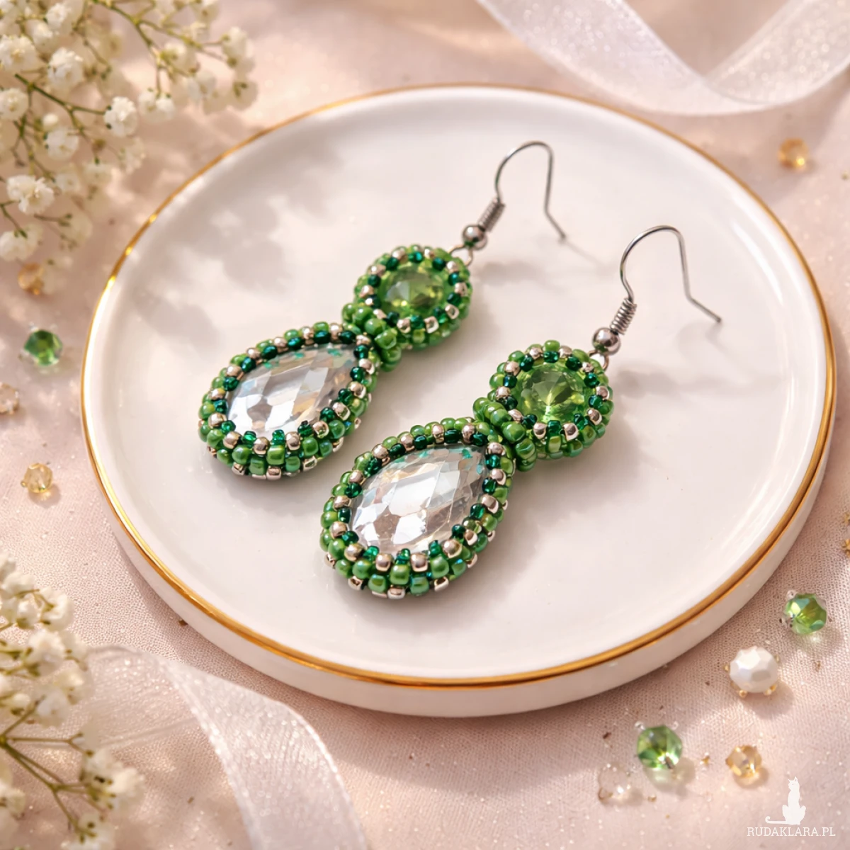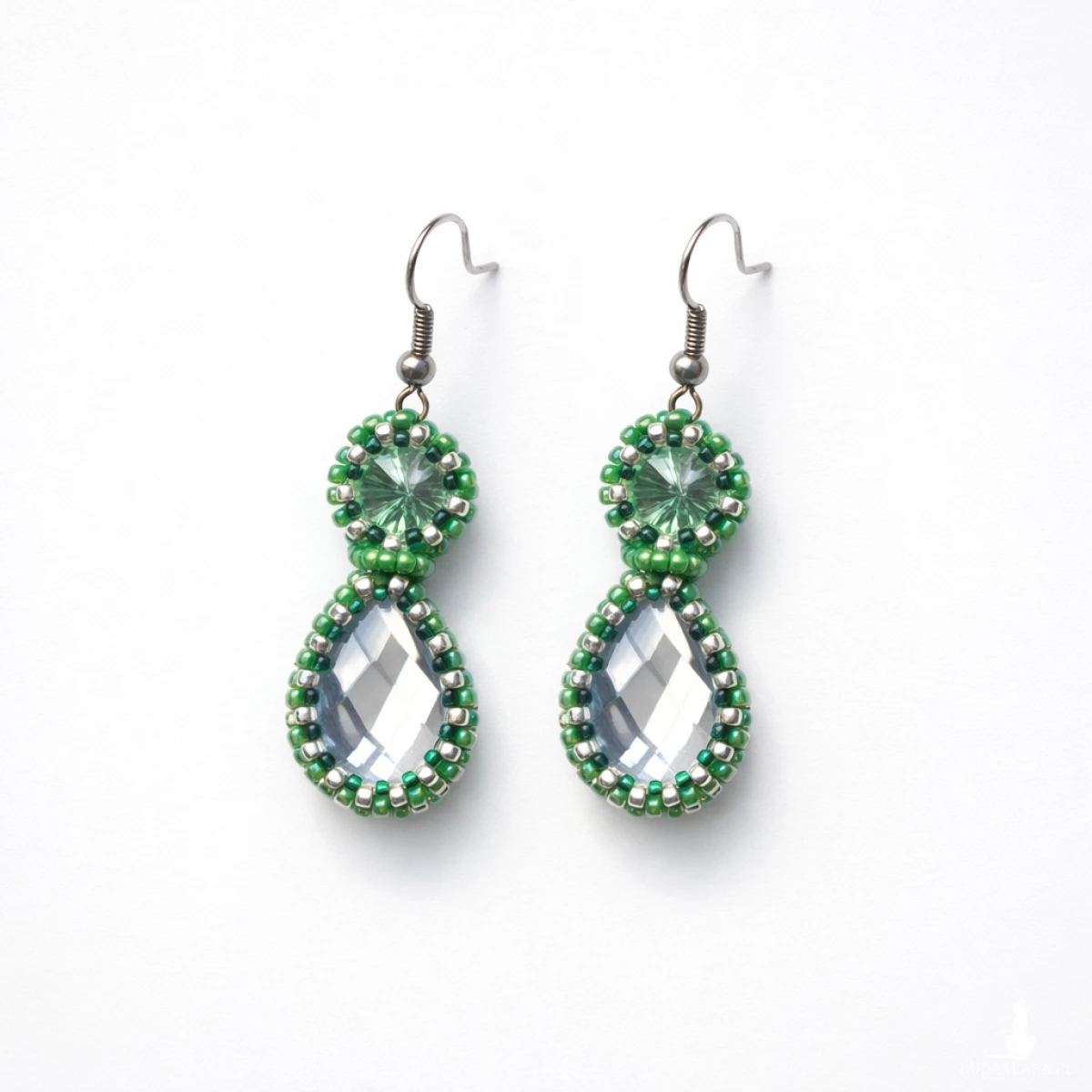 Eleganckie kolczyki zielono-srebrne wykonane ręcznie w technice haftu koralikowego. Połączenie intensywnej zieleni z połyskującymi srebrnymi koralikami i kryształowym elementem tworzy wyjątkową, subtelną biżuterię, która pięknie odbija światło i przyciąga spojrzenia.