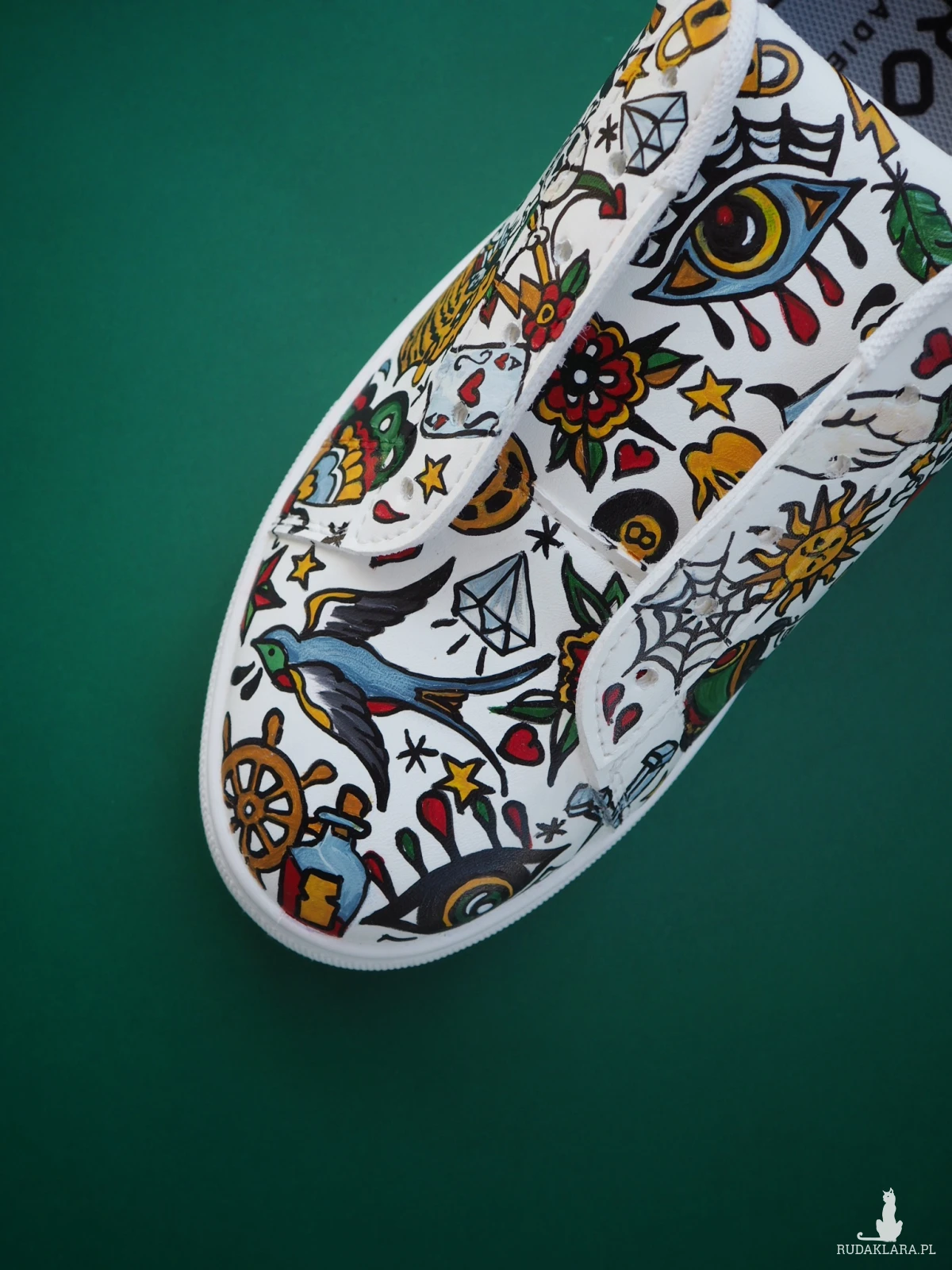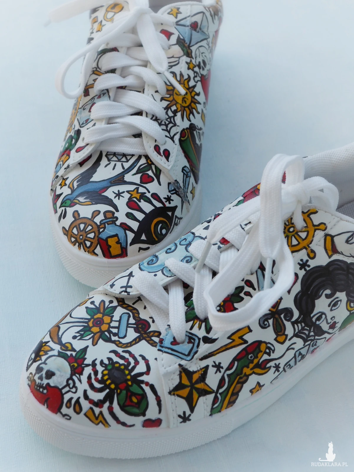 Ręcznie malowane trampki ze sztucznej skóry z wzorami tatuaży w styli american old school.
