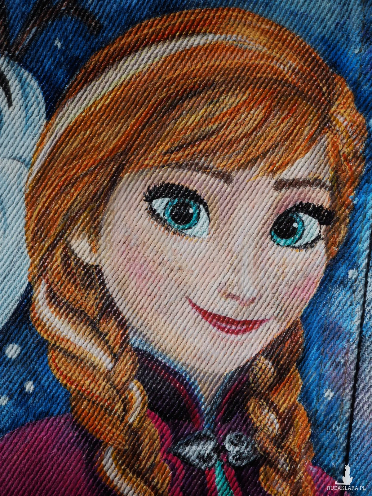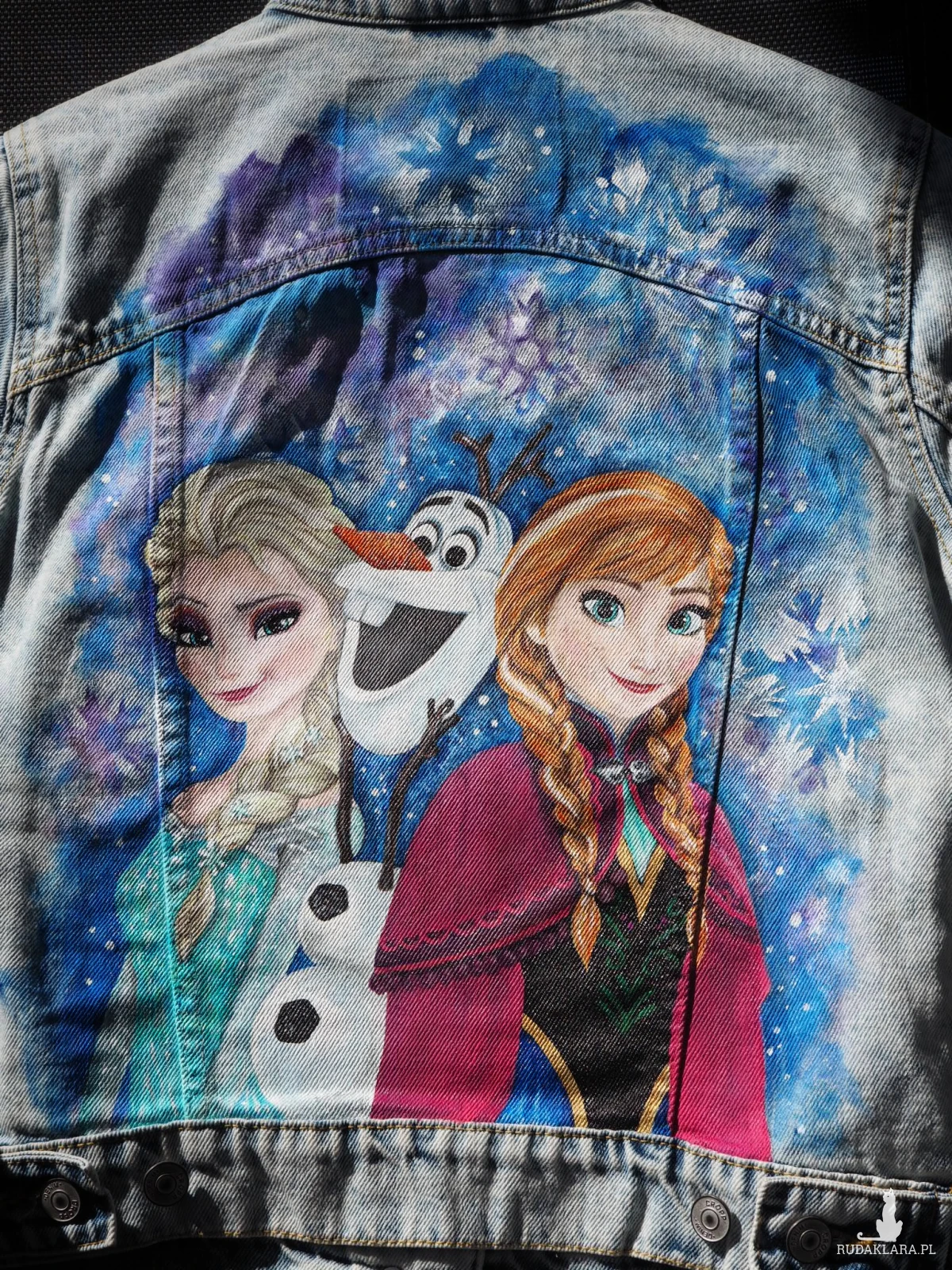 Ręcznie malowana jeansowa kurtka damska, idealna dla wielbicielki bajek, zimy, a szczególnie „Krainy Lodu”. Rozmiar odpowiedni zarówno dla drobnej dorosłej osoby, jak i dla dziecka.