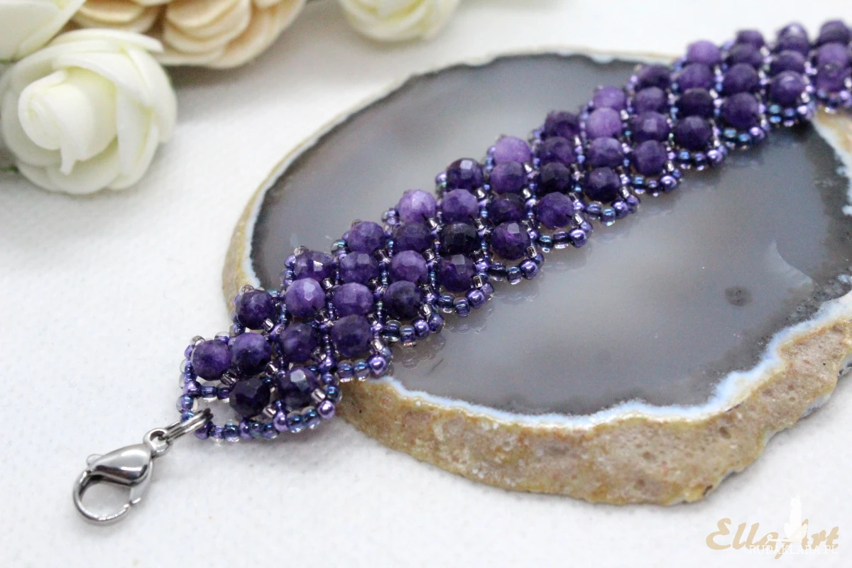 Bransoletka uszyta z naturalnych kamieni ametystu o wielkości 4mm.