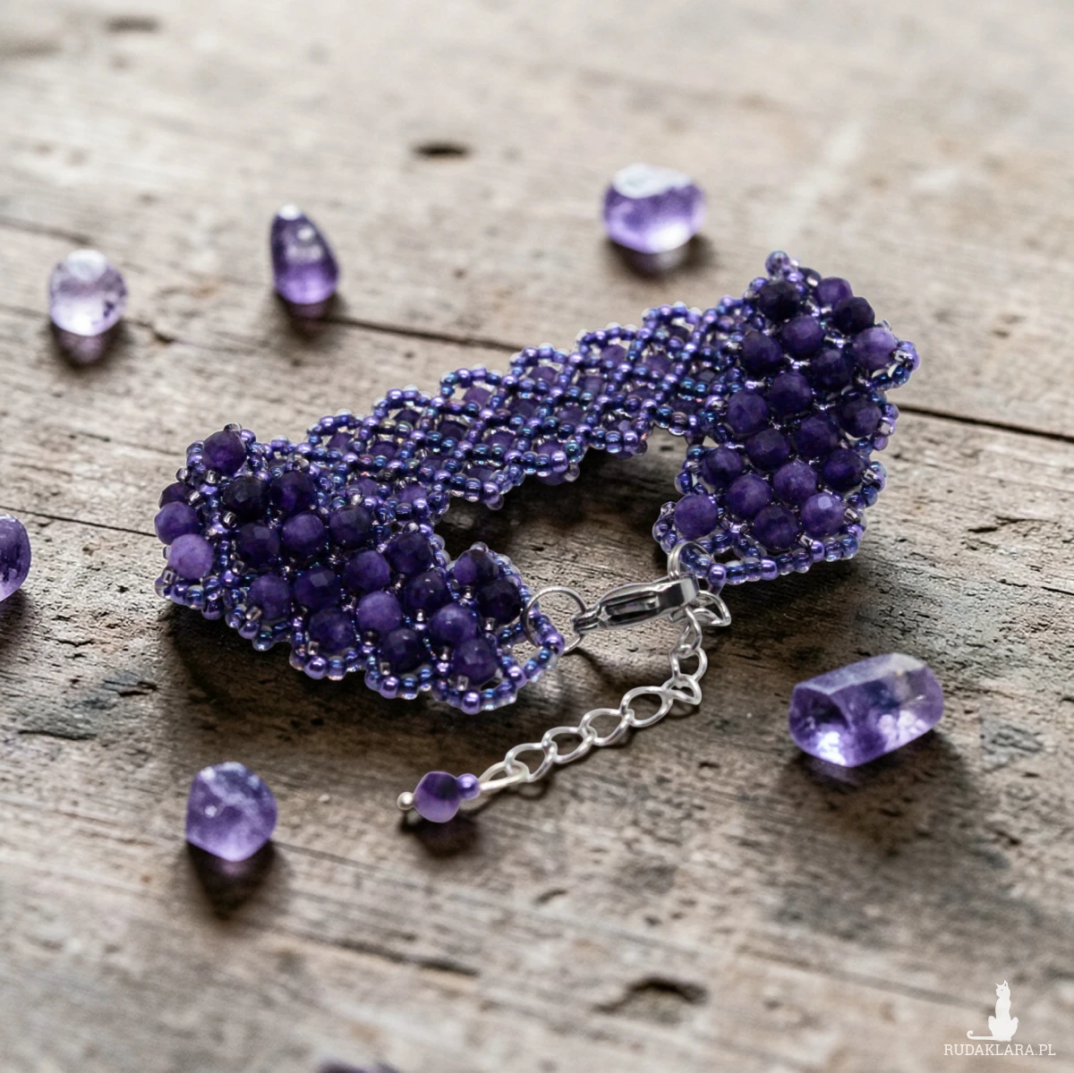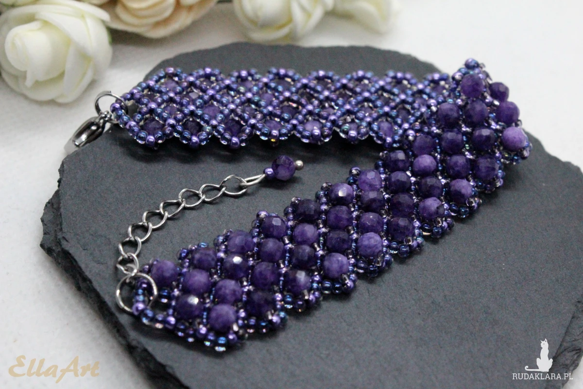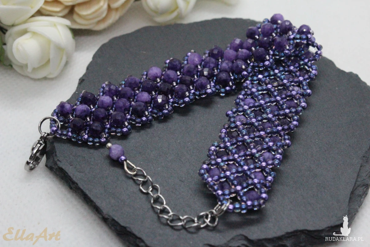 Kamienie zostały przyszyte do siatki z koralików japońskiej firmy Toho. Są to koraliki najwyższej jakości na świecie. Nie ścierają się i nie odbarwiają