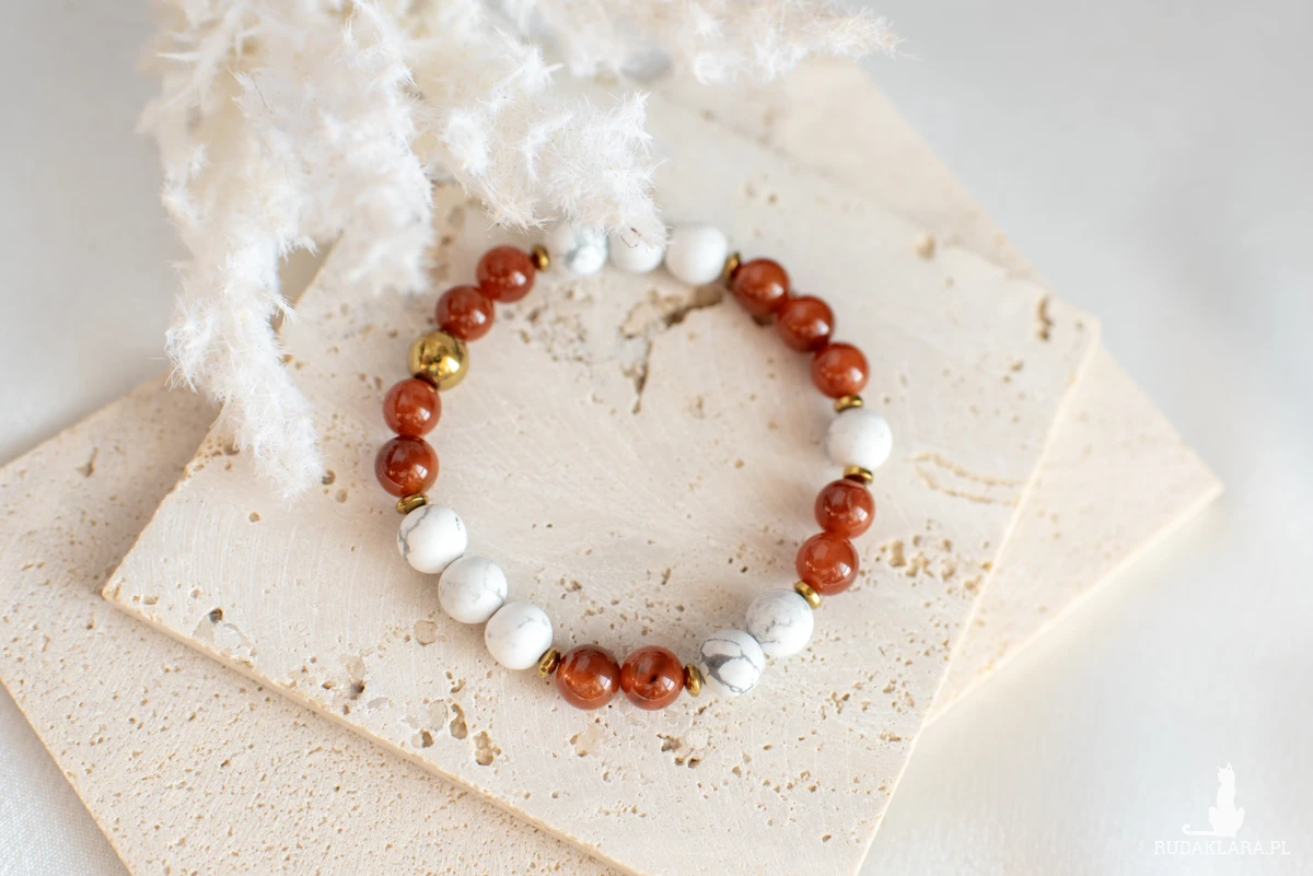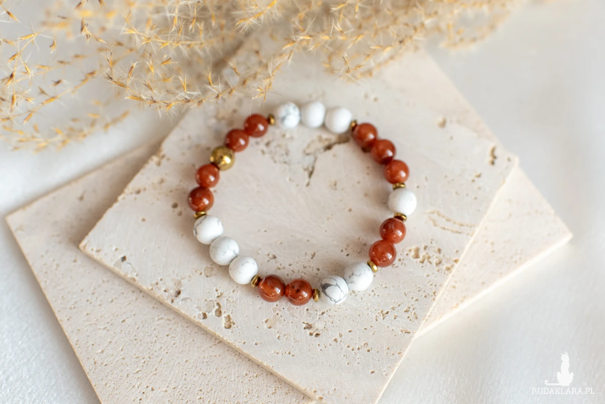 Bransoletka z agatu karneolowego i howlitu białego dla ceniących naturalne materiały, subtelną elegancję i pozytywną energię w biżuterii.