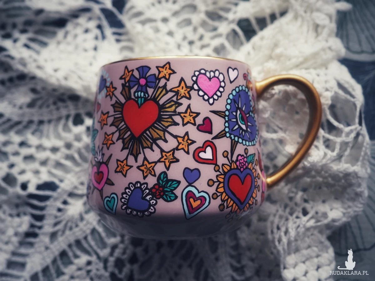 Ręcznie malowany kubek w żywych kolorach, z oryginalnym wzorem będzie doskonałym podarunkiem dla osoby kochającej oryginalne przedmioty.