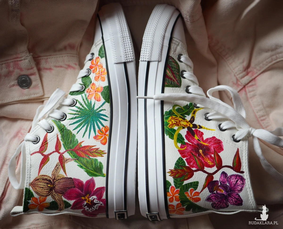 Ręcznie malowany kwiatowy wzór (tropikalne rośliny takie jak orchidea, monstera, strelicja, palma, tilandsja, hibiskus, helikonia, plumeria) wprowadzi nieco egzotyki i koloru w szare jesienne i zimowe dni.