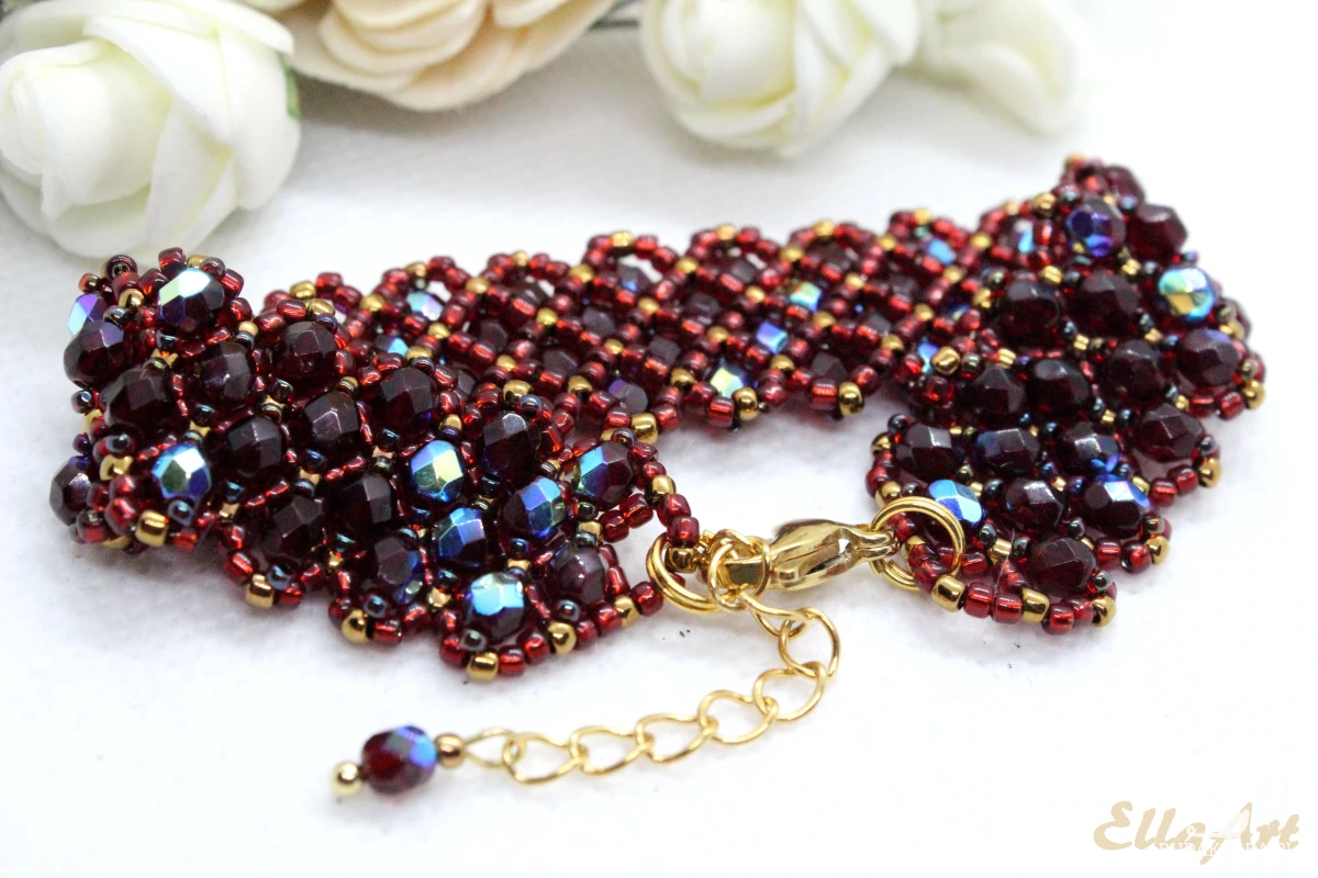 Bransoletka uszyta z kryształków FirePolish 4mm na siatce z koralików japońskiej firmy Toho11.