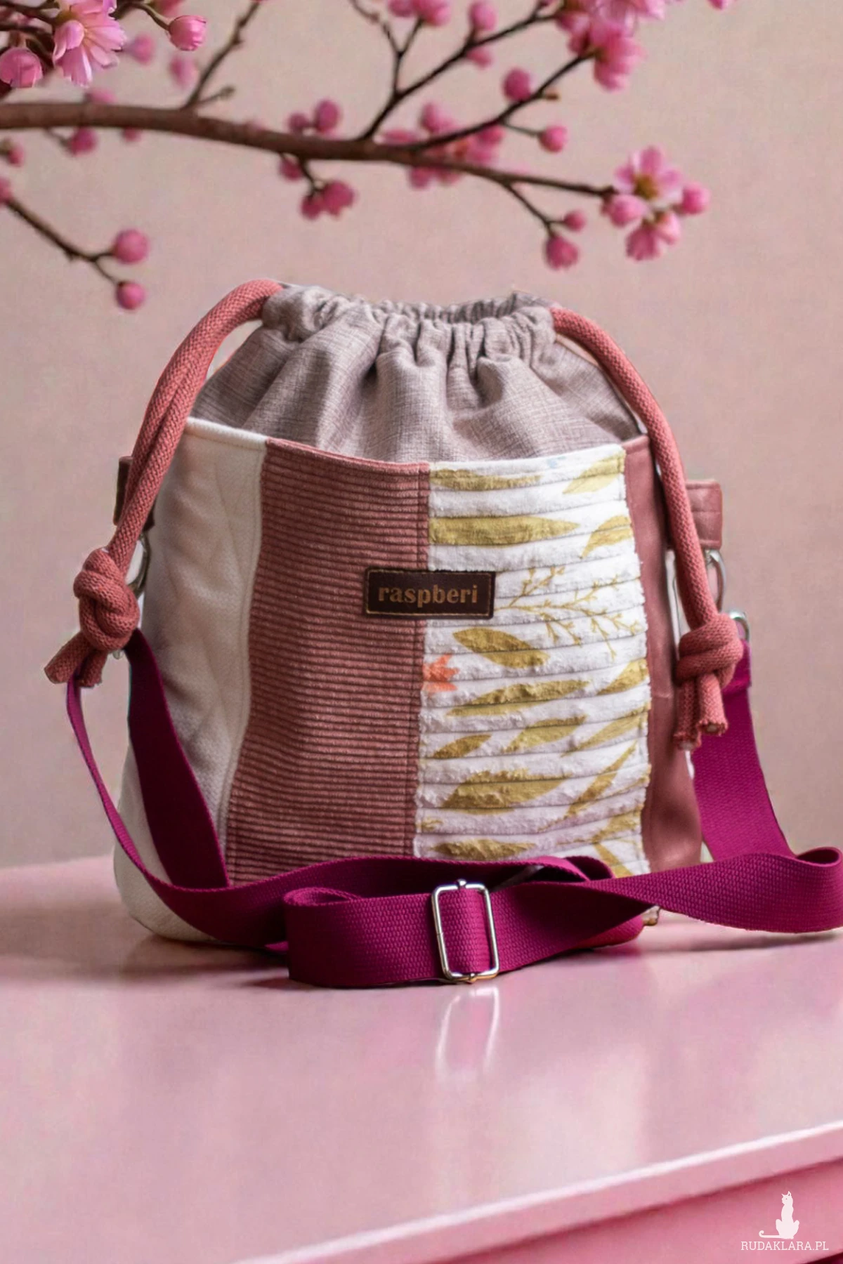Całość ściągana grubym, bawełnianym sznurkiem w kolorze różowym.