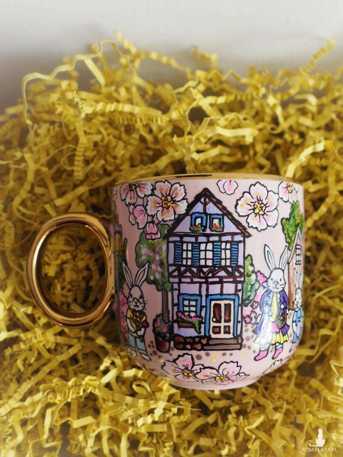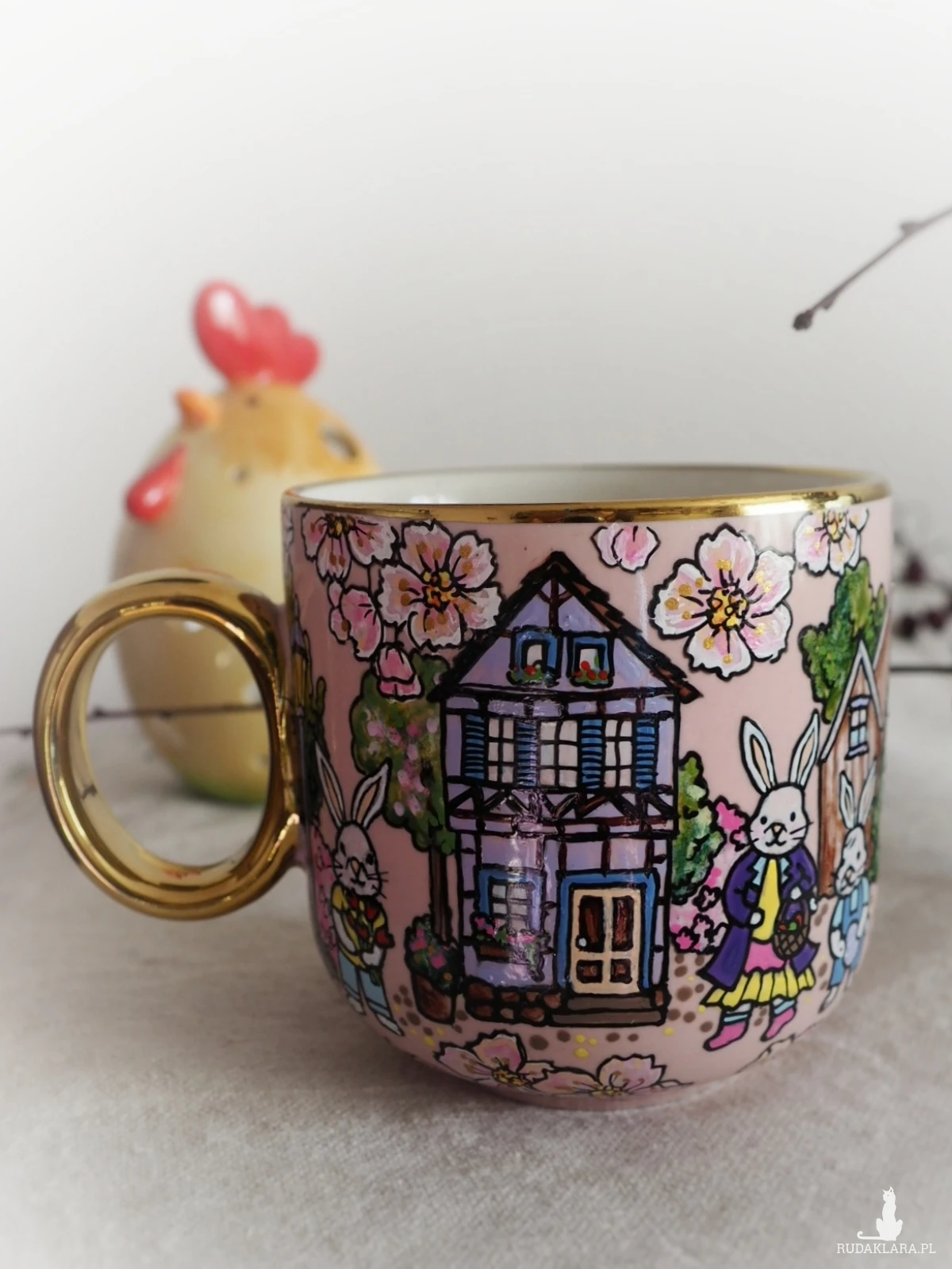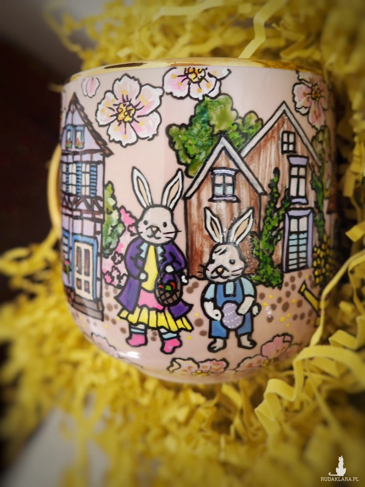 Ręcznie malowany kubek ze świątecznymi królikami będzie doskonałym upominkiem "na zajączka", wyrazi sympatię przy okazji wiosennych spotkań, rozweseli wielkanocny stół.