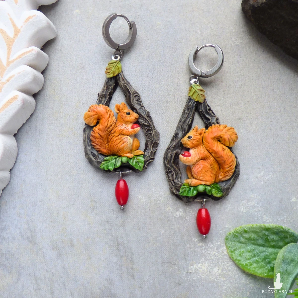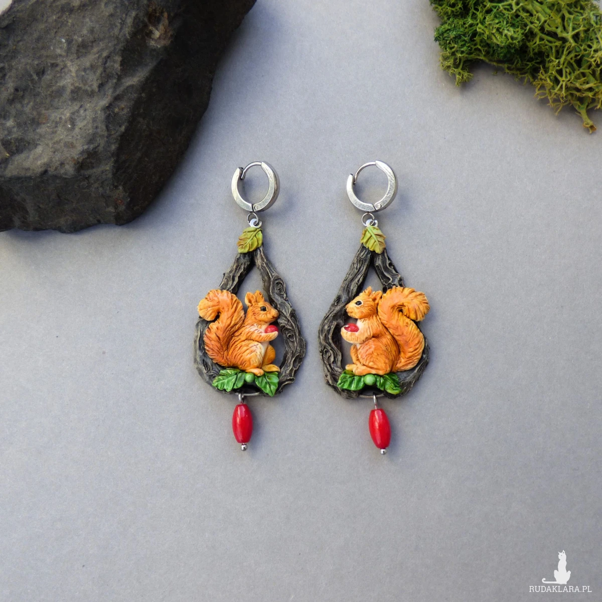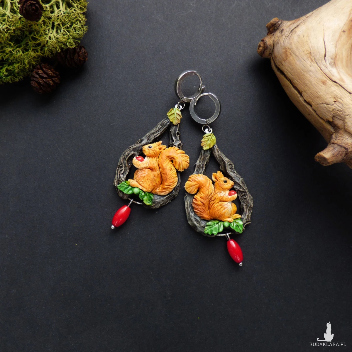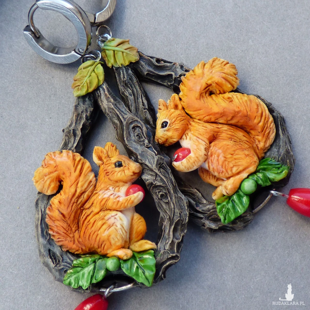 Kolczyki zaprojektowałam i wykonałam w pojedynczym egzemplarzu. Jest to w 100% rękodzieło, każdy element - wiewiórka, jej puszysty ogonek, listek, pień drzewa - jest modelowany i wykańczany ręcznie bez form i odlewów (drobne różnice są naturalne i dodają uroku).
