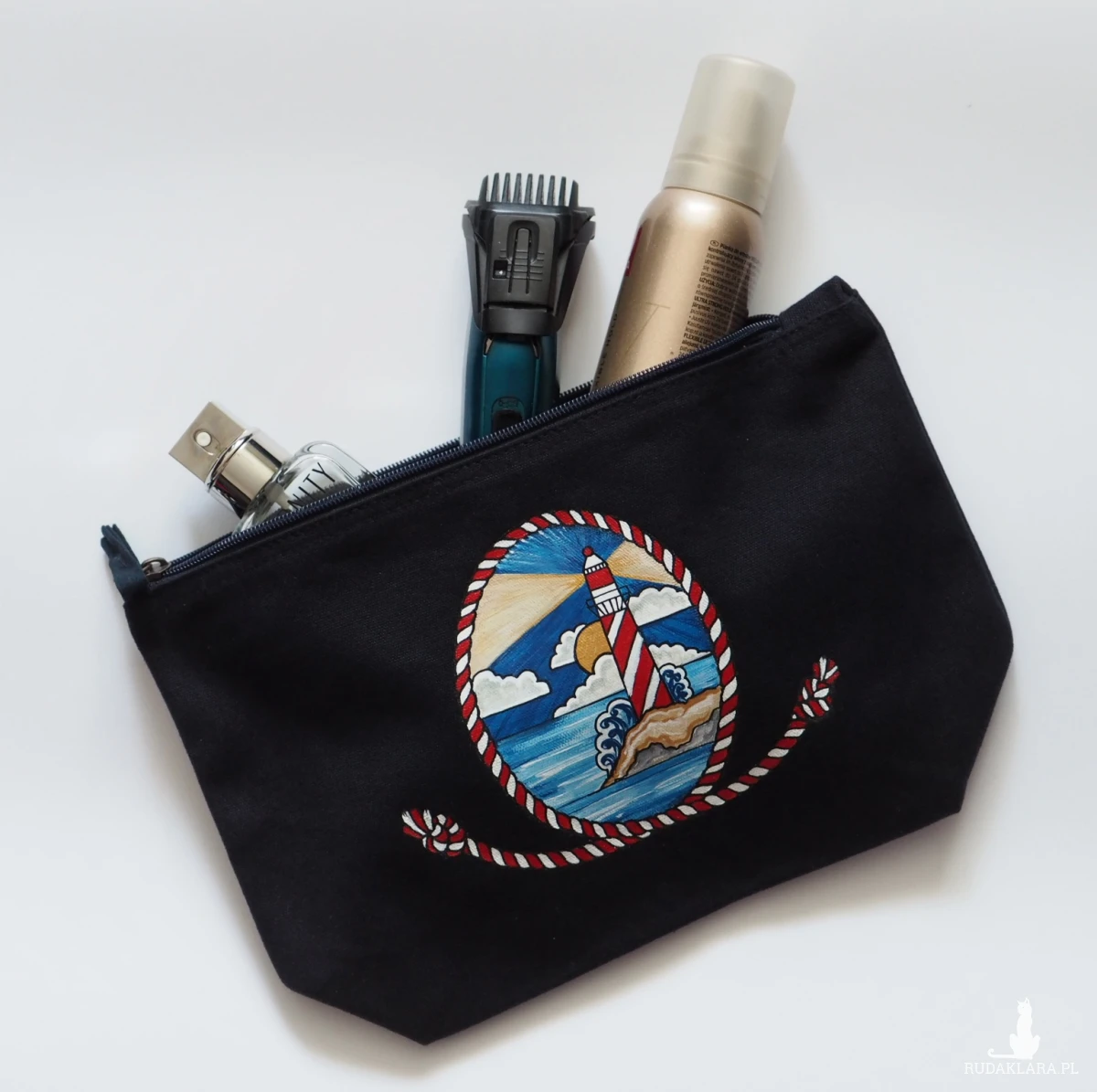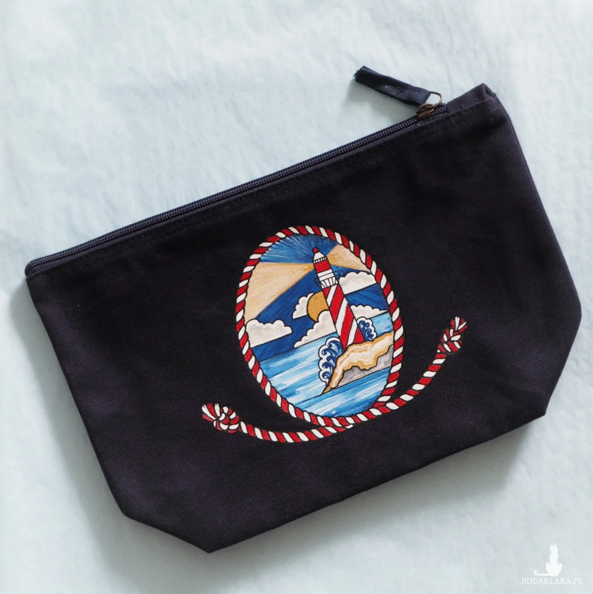 Doskonały prezent dla pasjonata żeglarstwa i każdej osoby kochającej morskie klimaty. Na życzenie na kosmetyczce mogę domalować imię obdarowywanej osoby. Namalowany wzór jest wodoodporny i trwały.