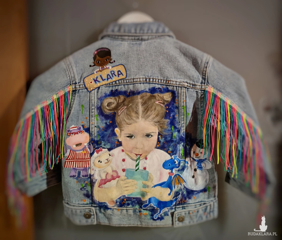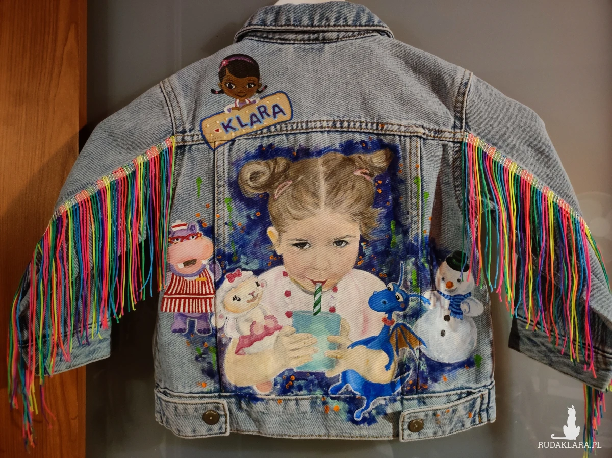 Następnie wybierz wzór - opisz, co chcesz umieścić na plecach kurtki (może to być portret dziecka - wówczas podeślij też kilka dobrej jakości zdjęć, wizerunek zabawki, bohatera książki lub filmu, zwierzęcia, ewentualnie dodatkowe elementy jak kwiatki, gwiazdki itp.). Dodatkowo, nasze dzieło może zostać ozdobione frędzlami, dżetami, błyskotkami itd. Istnieje nieskończona liczba możliwości, tak jak nieograniczona jest fantazja dziecka.