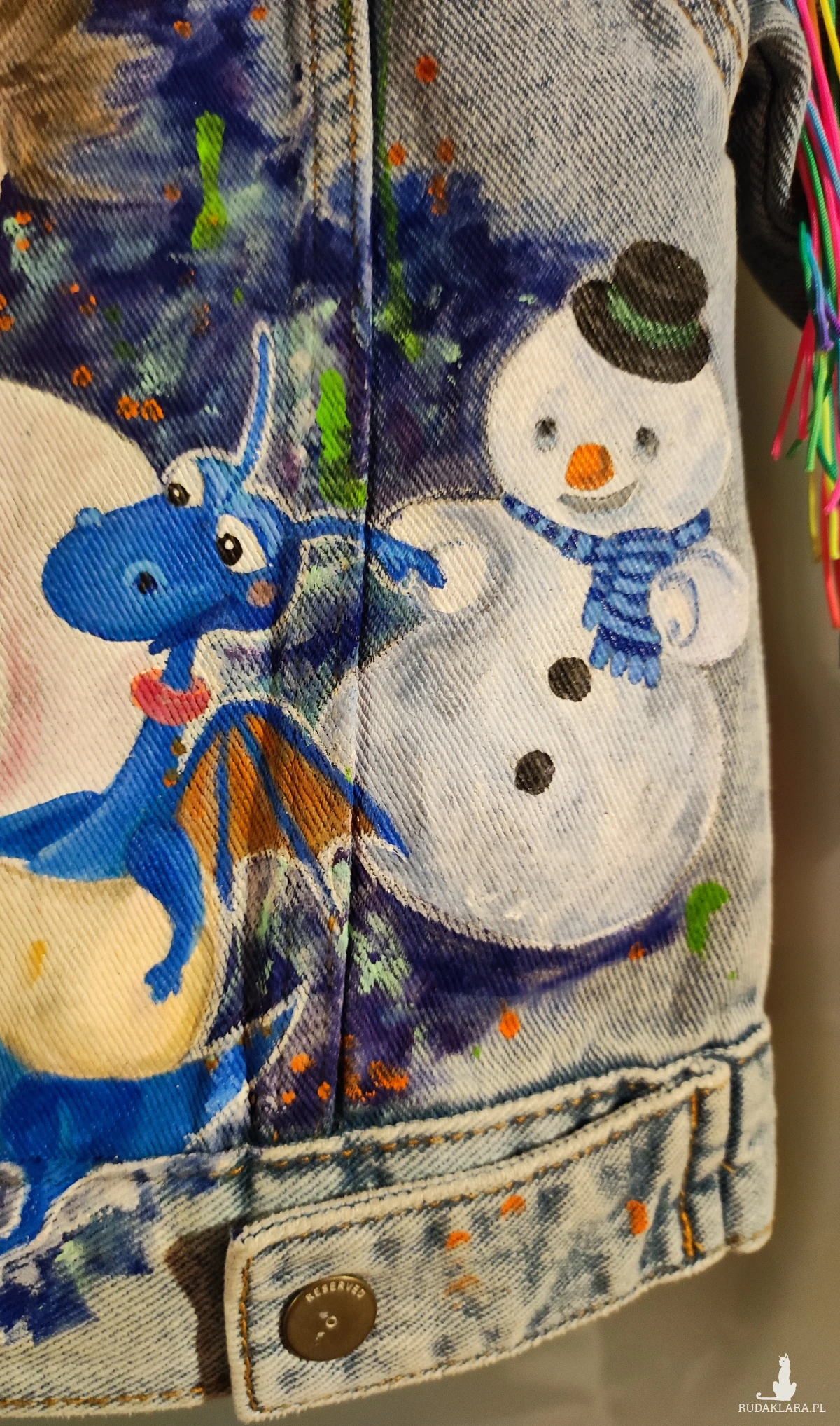 Wzór wykonany zostanie przy użyciu profesjonalnych farb do tkanin, nietoksycznych, trwałych i wodoodpornych. Kurtkę można prać w pralce. Szczegółowa instrukcja prania będzie dołączona do gotowego produktu.