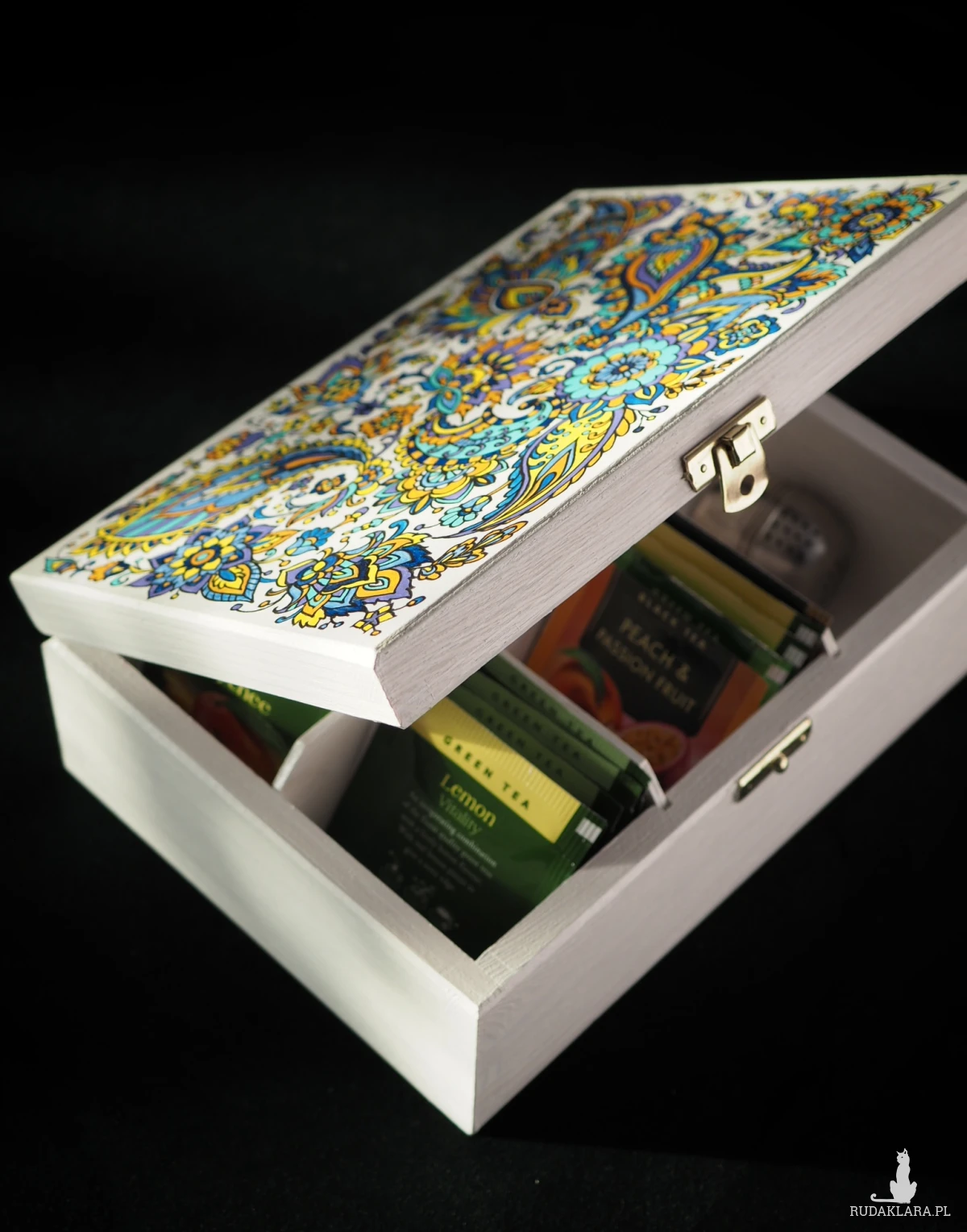 Korpus skrzyneczki wykonany jest z drewna sosnowego, pomalowany nietoksycznymi farbami akrylowymi i pokryty satynowym lakierem. Wnętrze pomalowane na biało. Metalowy zamek w kolorze złotym. 5 przegródek tego pudełka doskonale sprawdzi się do przechowywania torebek z herbatą, biżuterii lub do uporządkowania drobnych przedmiotów używanych w domu. Ręcznie wykonana, o niepowtarzalnym wzorze, herbaciarka będzie świetnym prezentem dla rodziny i przyjaciół lub miłym niezobowiązującym upominkiem dla każdej osoby, której chcesz podziękować, wyrazić wdzięczność lub ciepłe uczucia.