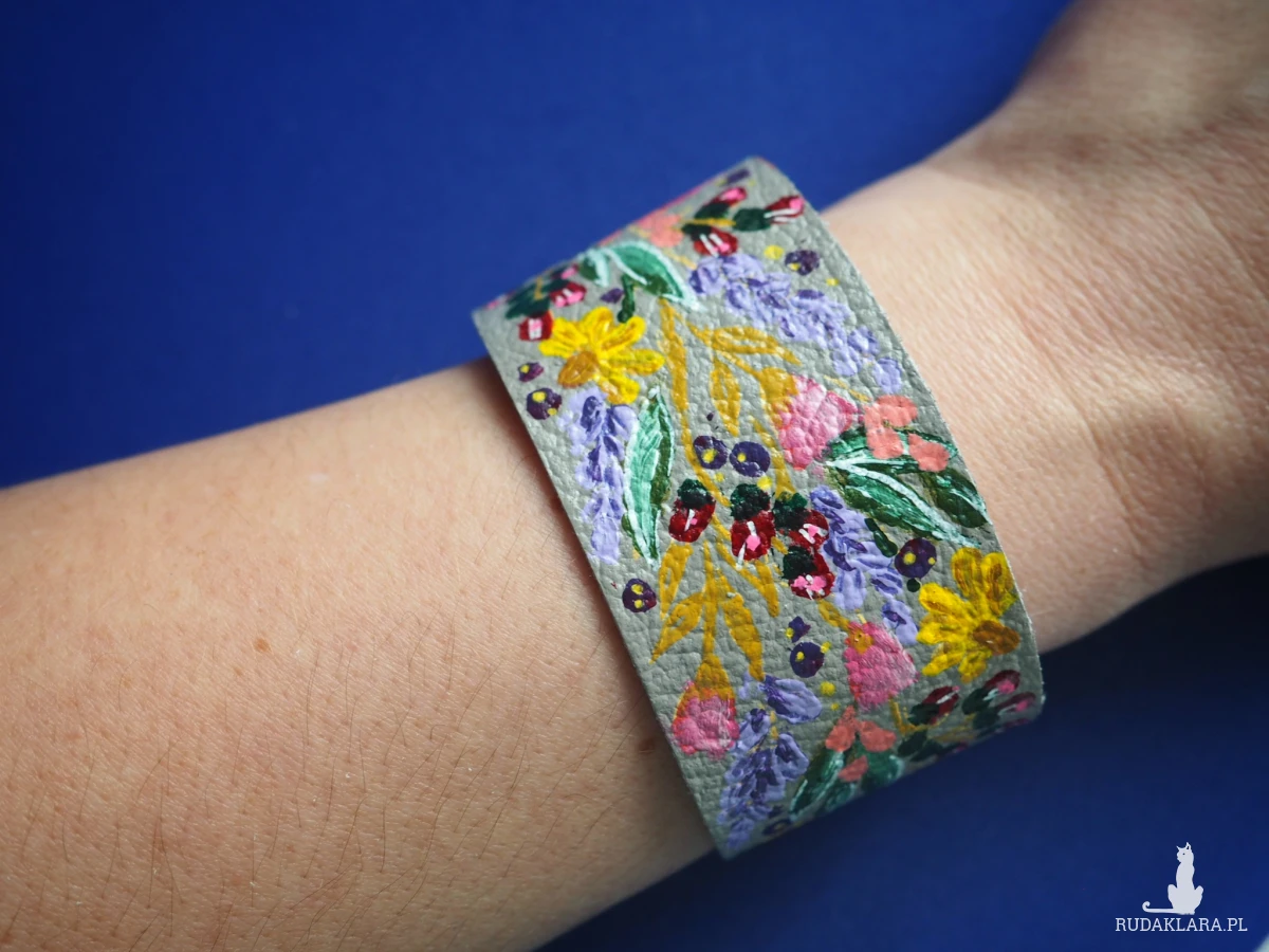 Ręcznie malowana skórzana bransoleta zapinana na zatrzaski.