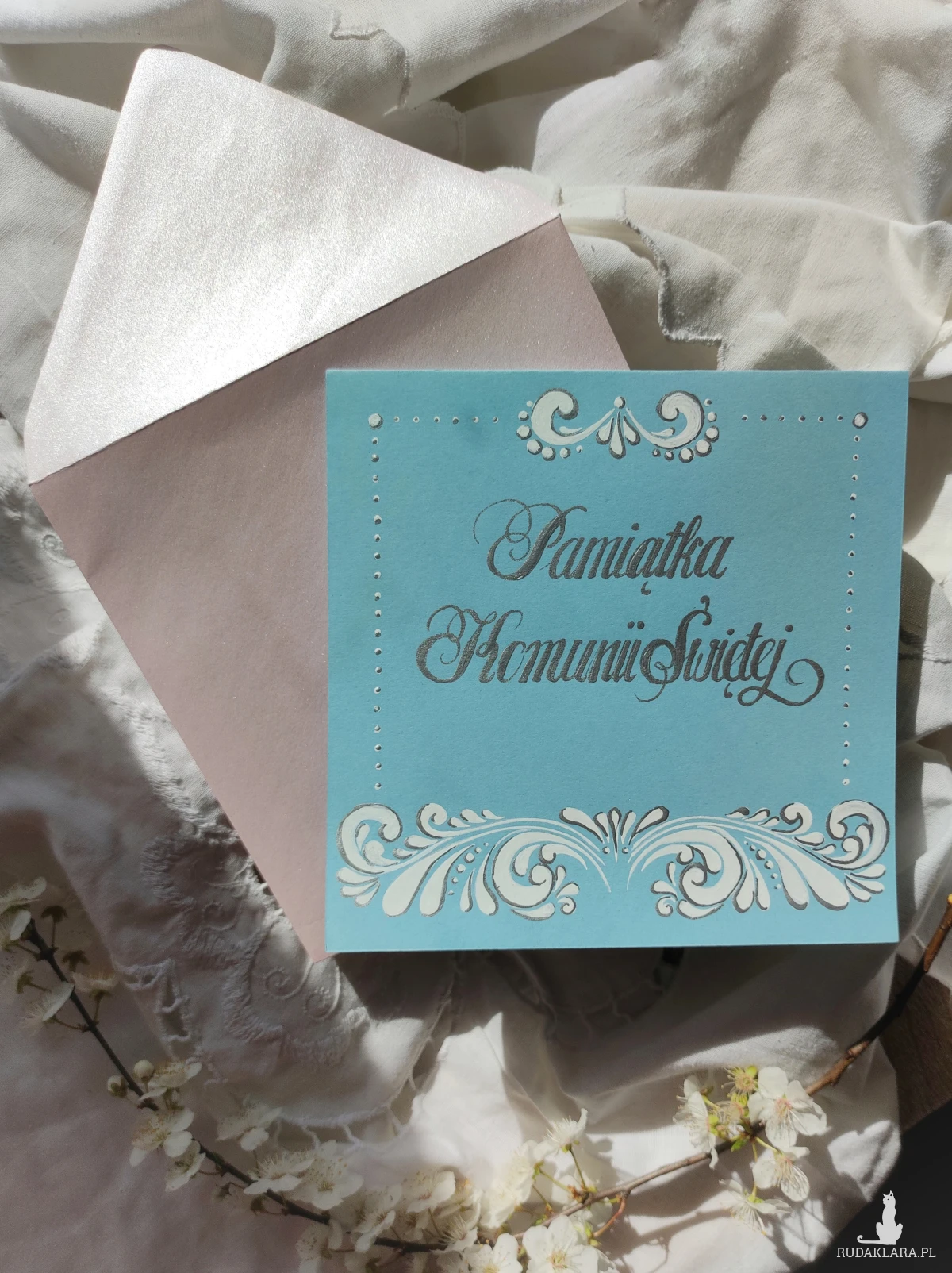 Do kartki z ręcznie wykonanym motywem dopasowana perłoworóżowa koperta. W miarę dostępności możliwość dobrania innego koloru koperty.