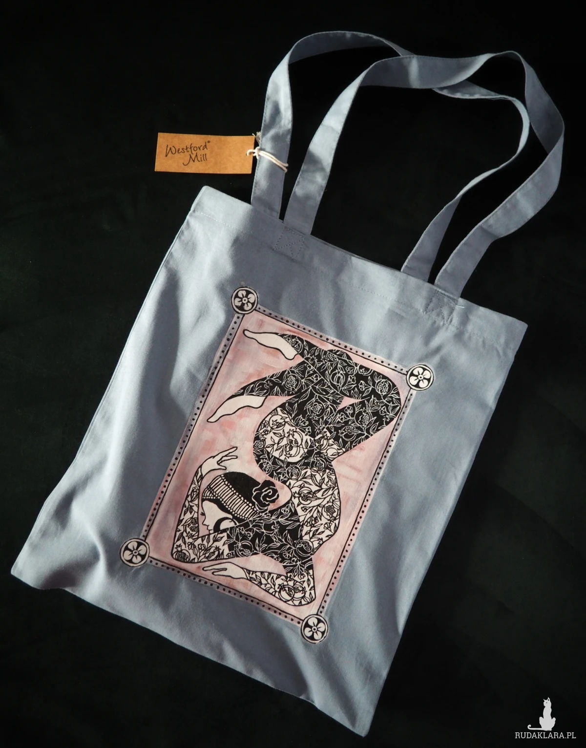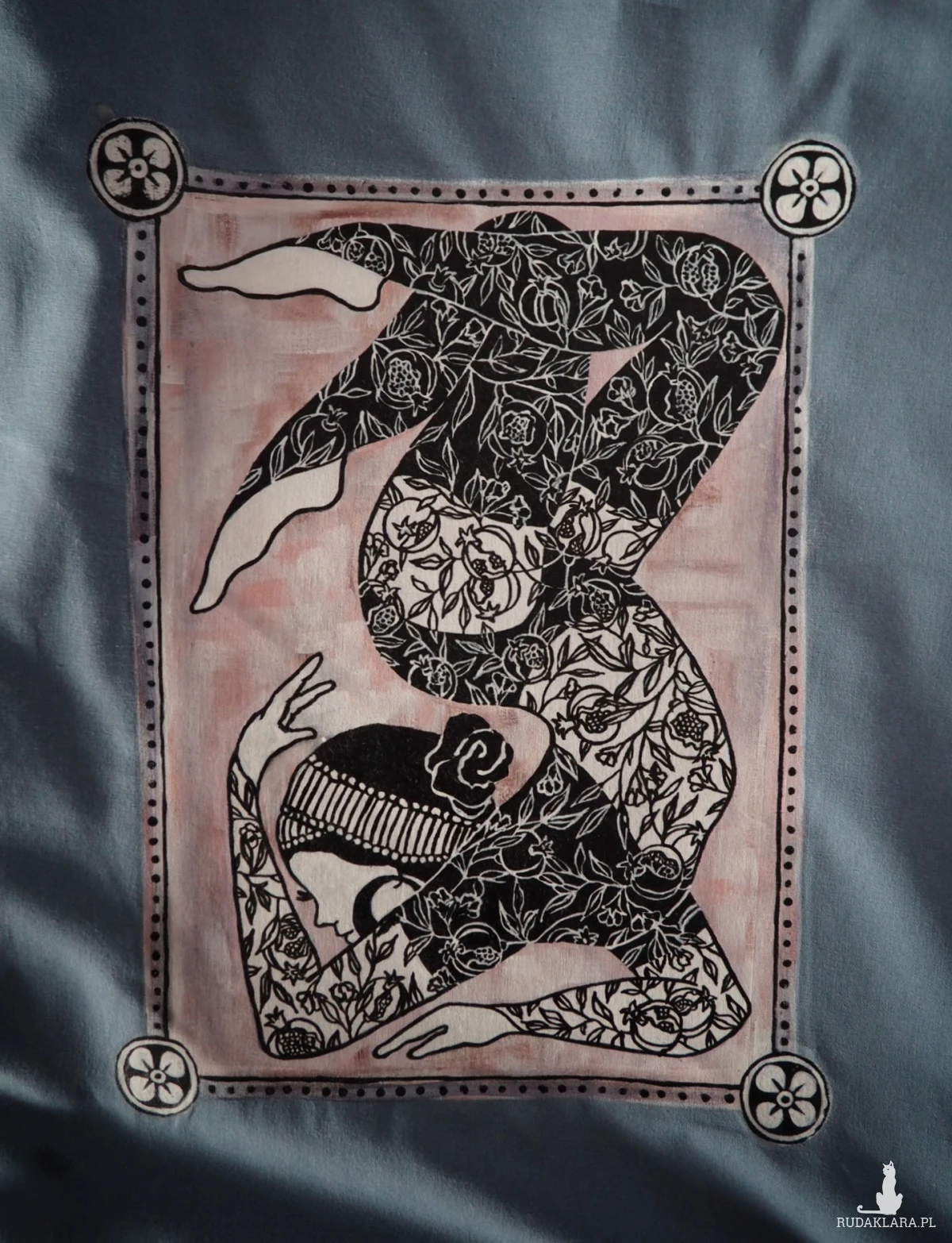 Ręcznie malowana bawełniana torba zakupowa z wzorem joginki. Będzie doskonałym uzupełnieniem stroju lub prezentem imieninowym, urodzinowym, gwiazdkowym itp. dla osoby ceniącej rękodzieło. Torba będzie idealna na zajęcia sportowe (na jogę!), do pracy, na spacer po mieście, do szkoły - zmieści teczkę z dokumentami, drugie śniadanie, wodę, telefon, portfel itd. Ciekawy wzór przyciągnie spojrzenia wokół. Sprawdzi się zarówno na co dzień, jak i na wakacyjny wyjazd. Wzór na torbie jest trwały i wodoodporny - torbę można wyprać ręcznie w temp. do 30 stopni (nie wykręcać, nie wirować - powiesić z wodą do odcieknięcia. Można prasować po lewej stronie).
