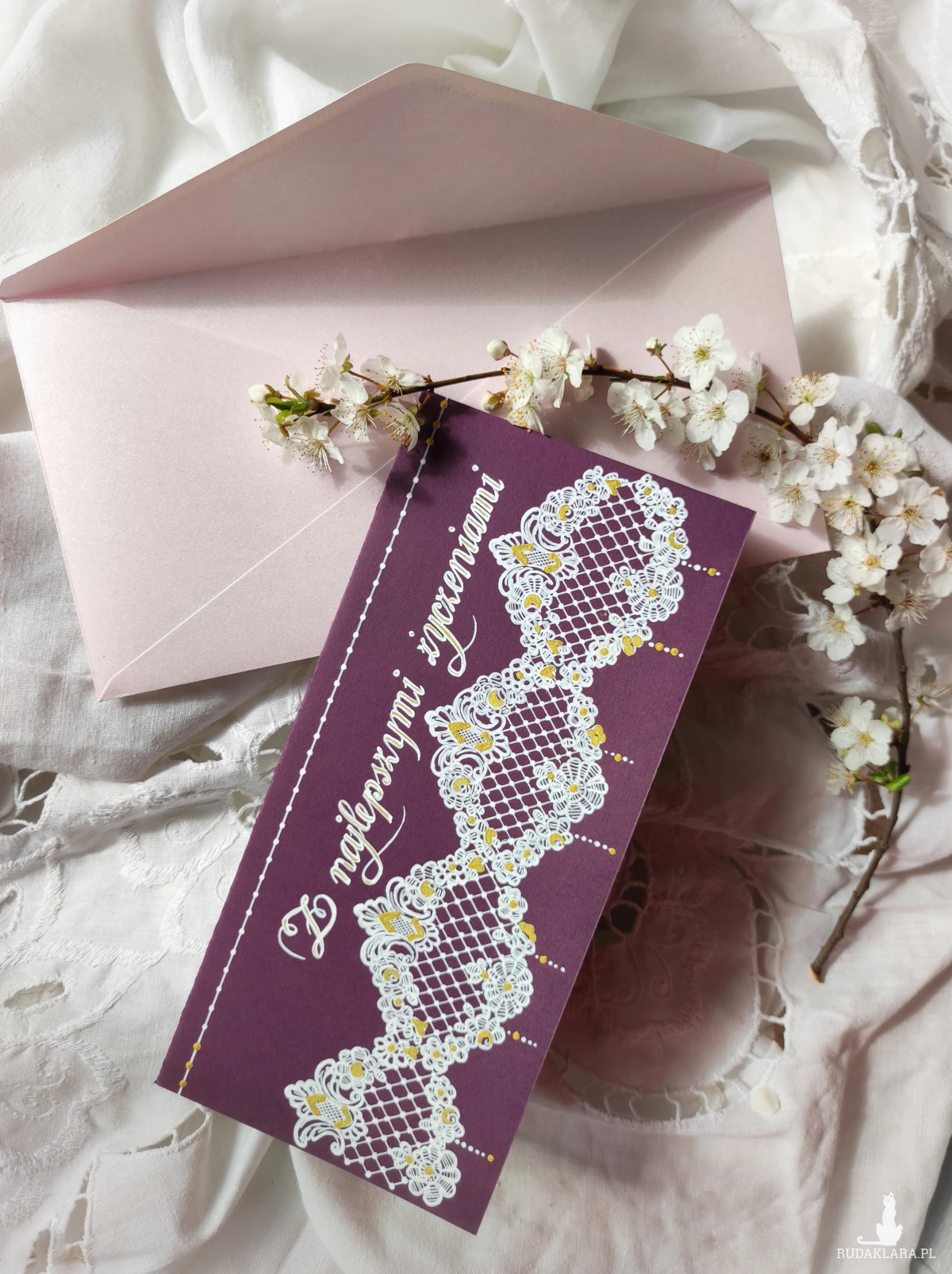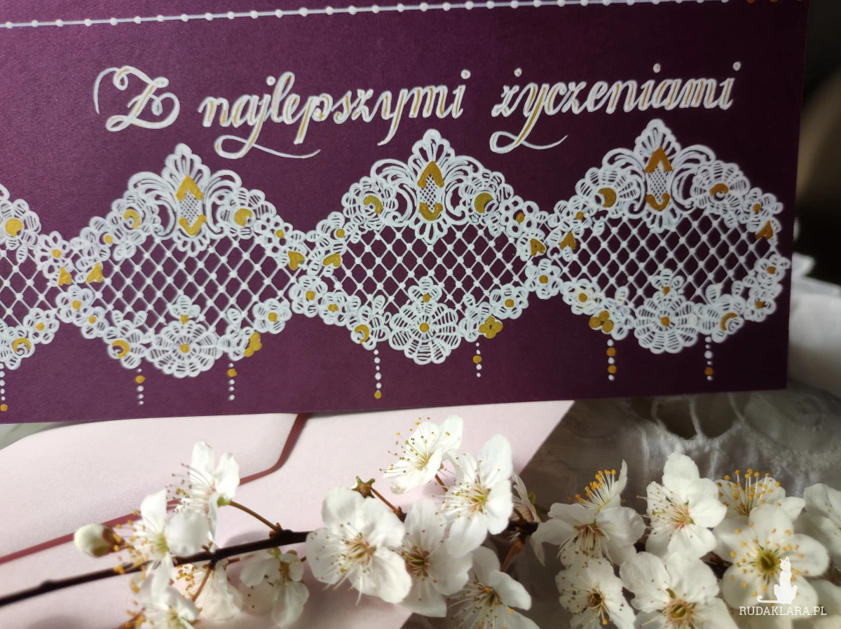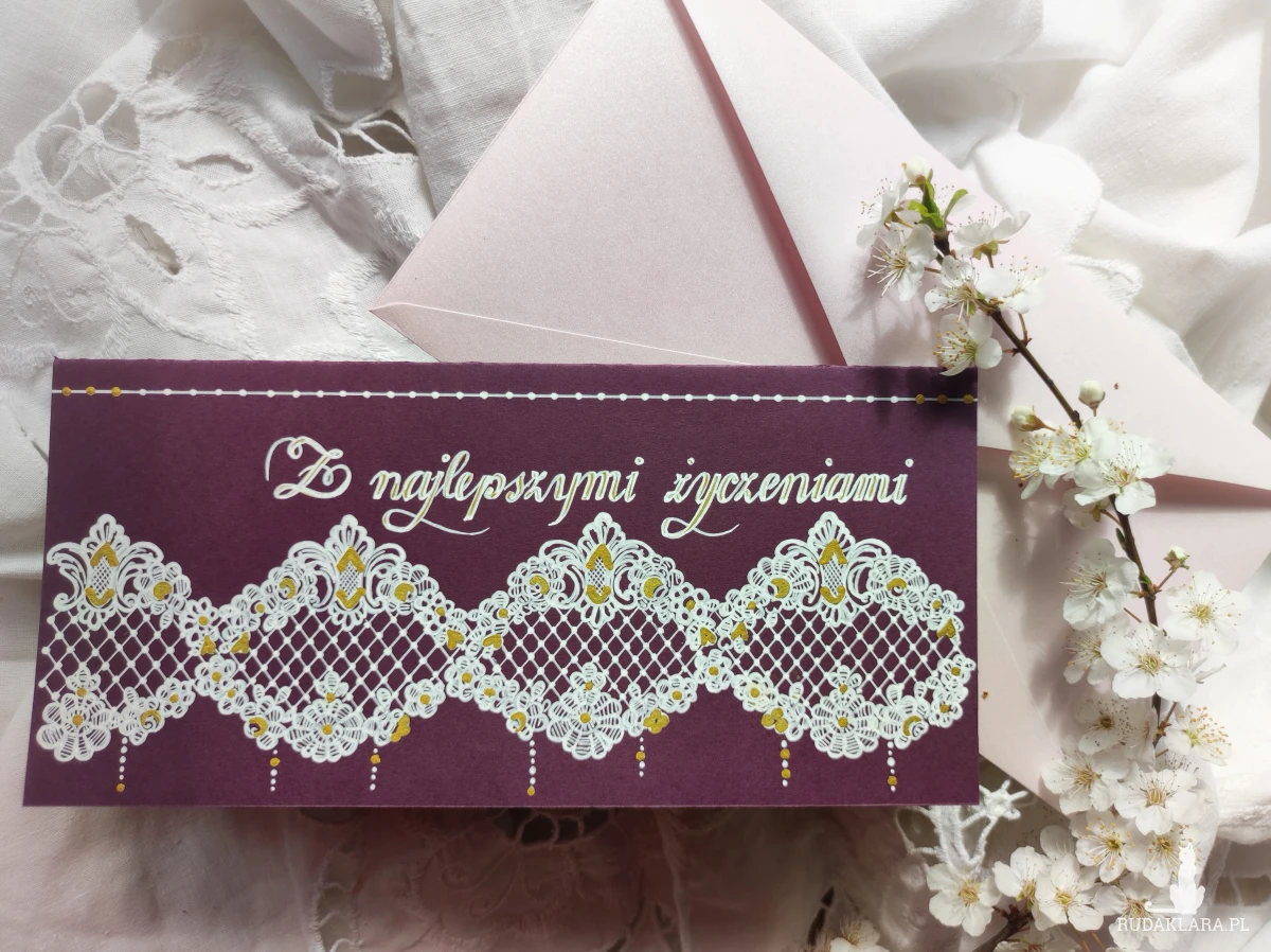 Do kartki z ręcznie wykonanym motywem dopasowana perłoworóżowa koperta. W miarę dostępności możliwość dobrania innego koloru koperty.