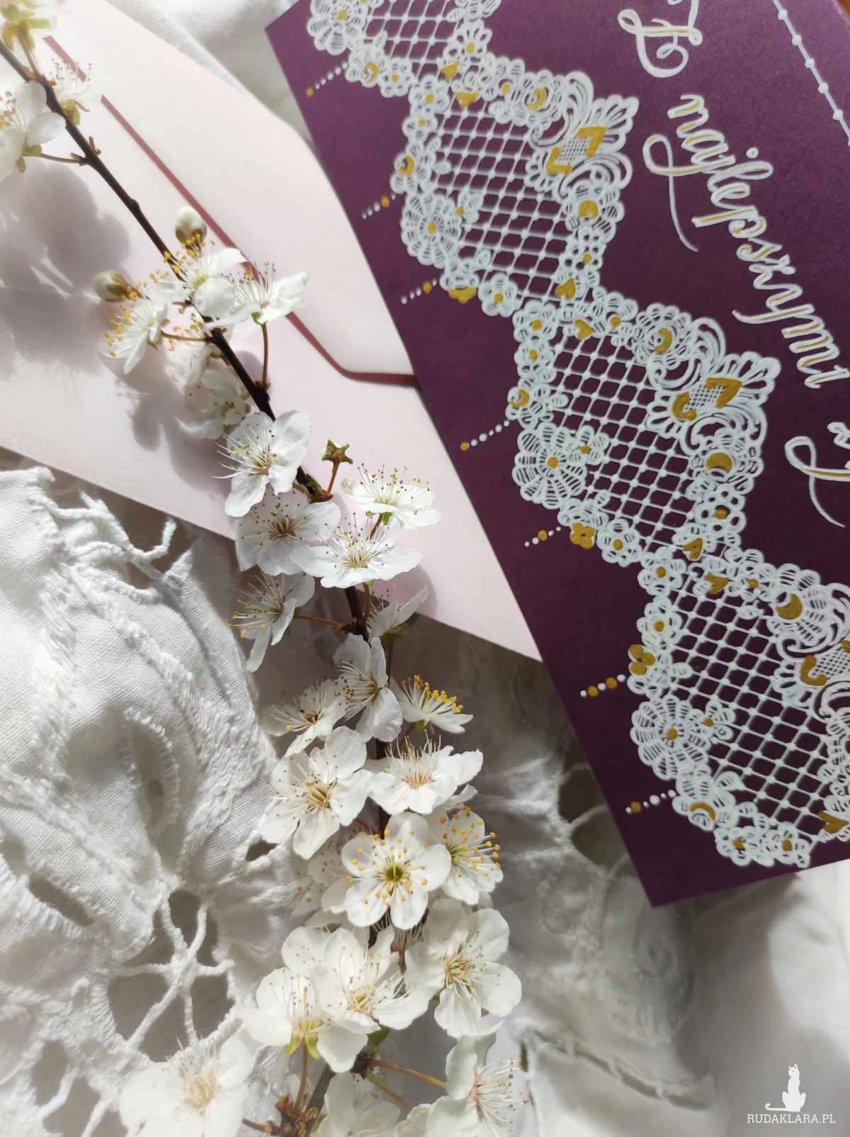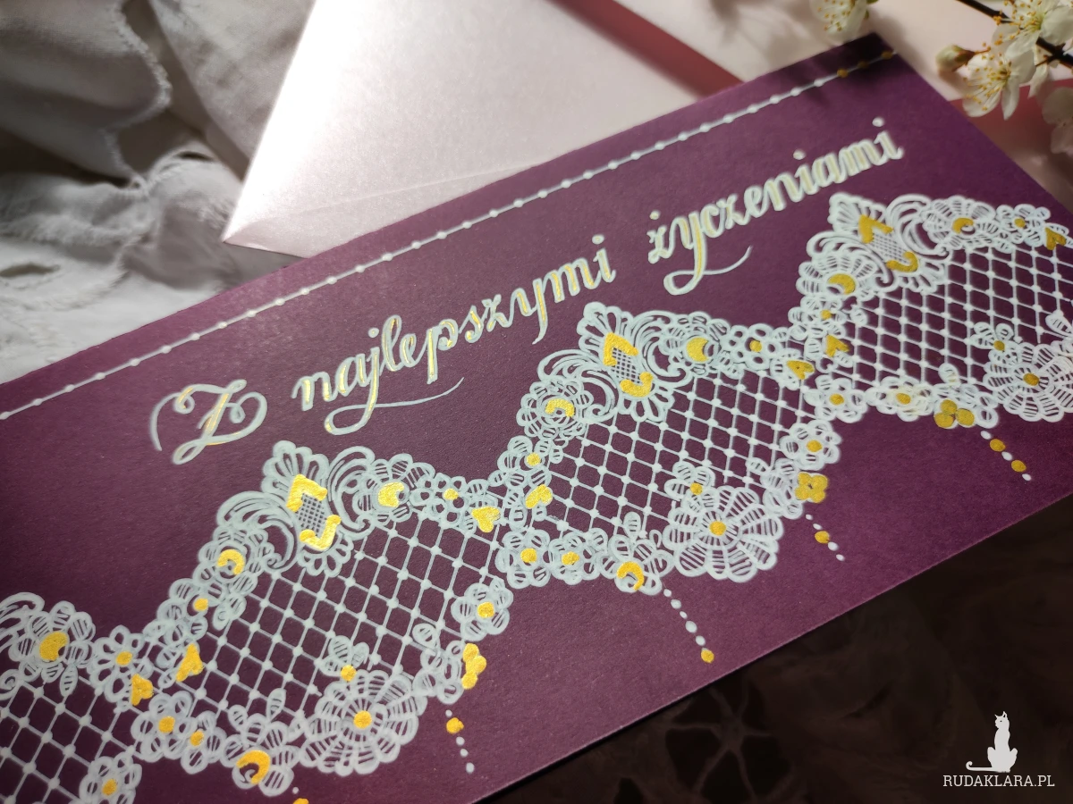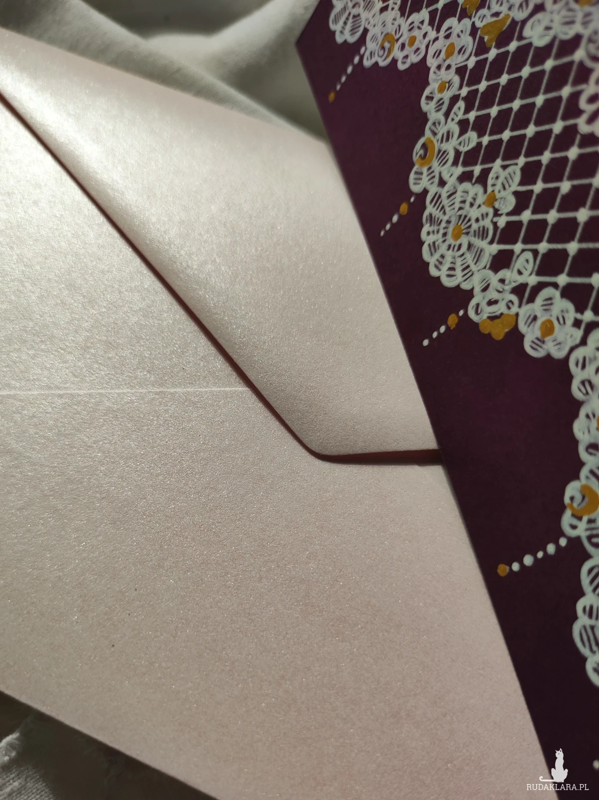 Do kartki z ręcznie wykonanym motywem dopasowana perłoworóżowa koperta. W miarę dostępności możliwość dobrania innego koloru koperty.