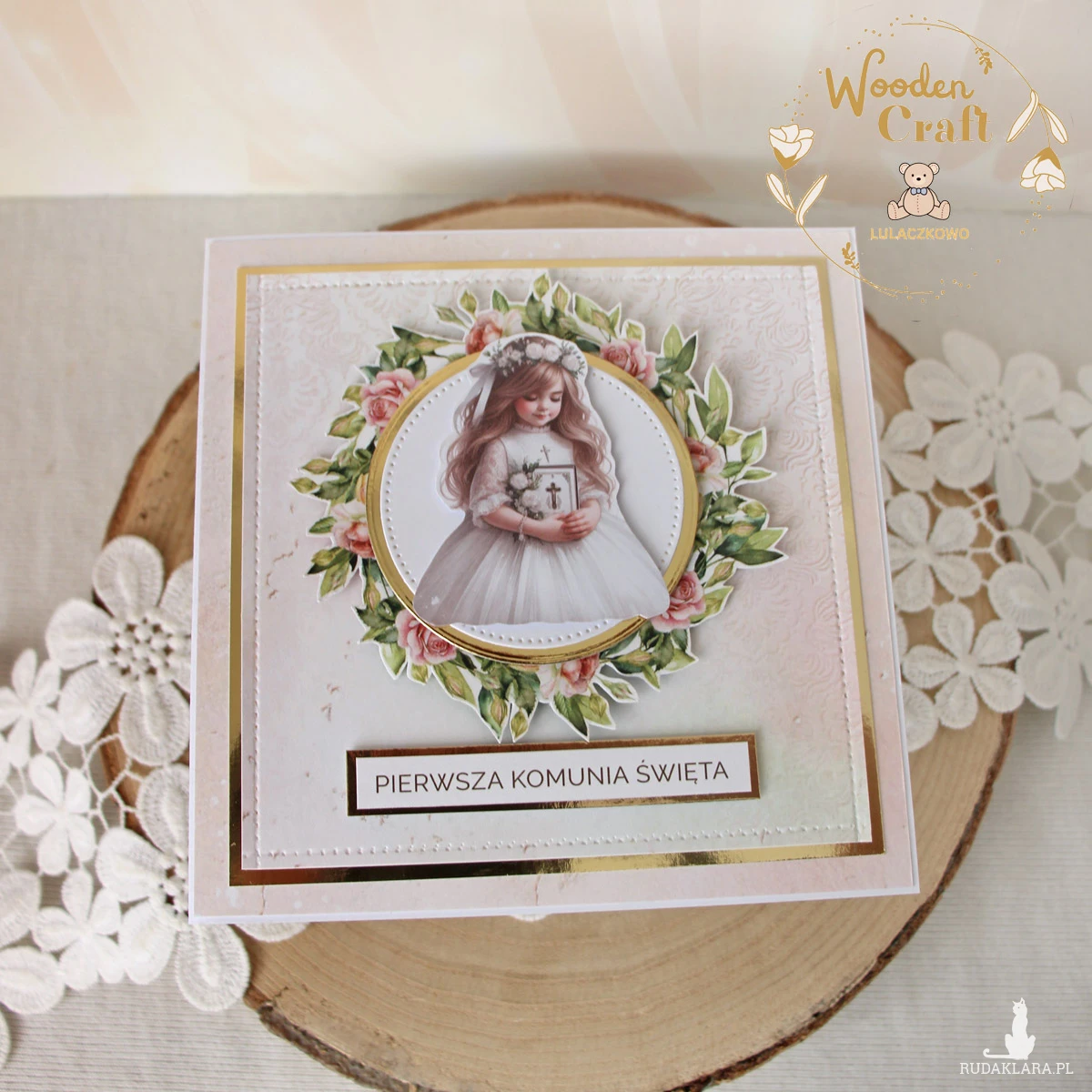 Piękna, elegancka kartka komunijna, pamiątka Pierwszej Komunii Świętej mieszcząca się do koperty, wykonana ręcznie z najwyższą starannością, z cudownej kolekcji papierów "Rose Wine", utrzymana w pastelowych odcieniach malinowego różu, kremu i bieli, z dodatkiem złotych, błyszczących akcentów. Na środku kartki umieszona została grafika dziewczynki komunijnej otoczona kwiatowym wianuszkiem, dodatkowo napis "Pierwsza Komunia Święta"- do napisu mogę również dodać imię dziecka lub całkowicie zmienić go na inny.