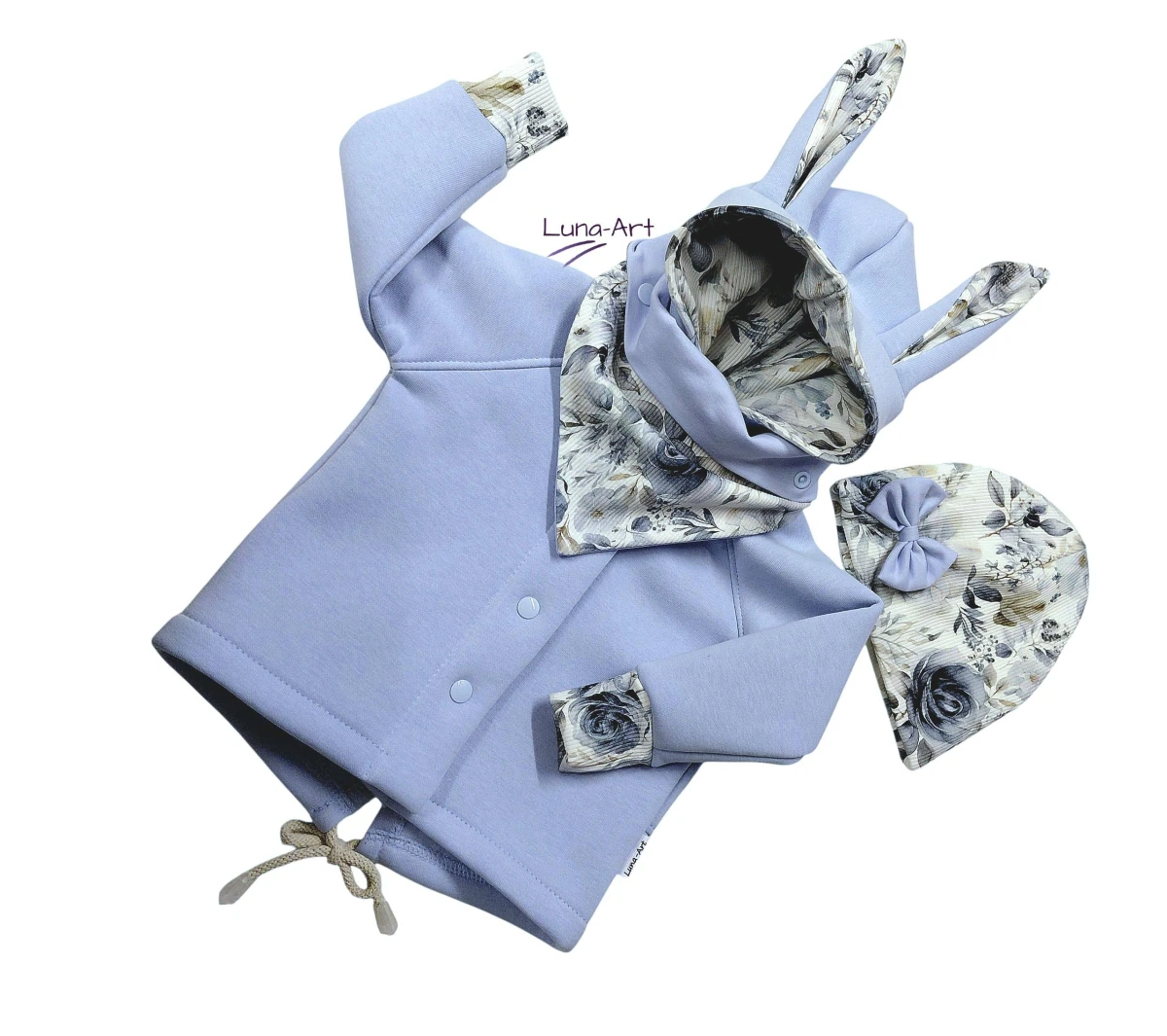 W kapturze, uszach, na końcówkach rękawów oraz ozdobne kokardki to dzianina prążkowana w kwiatki wzór cyfrowy. Z tyłu ozdobny, bawełniany sznurek.