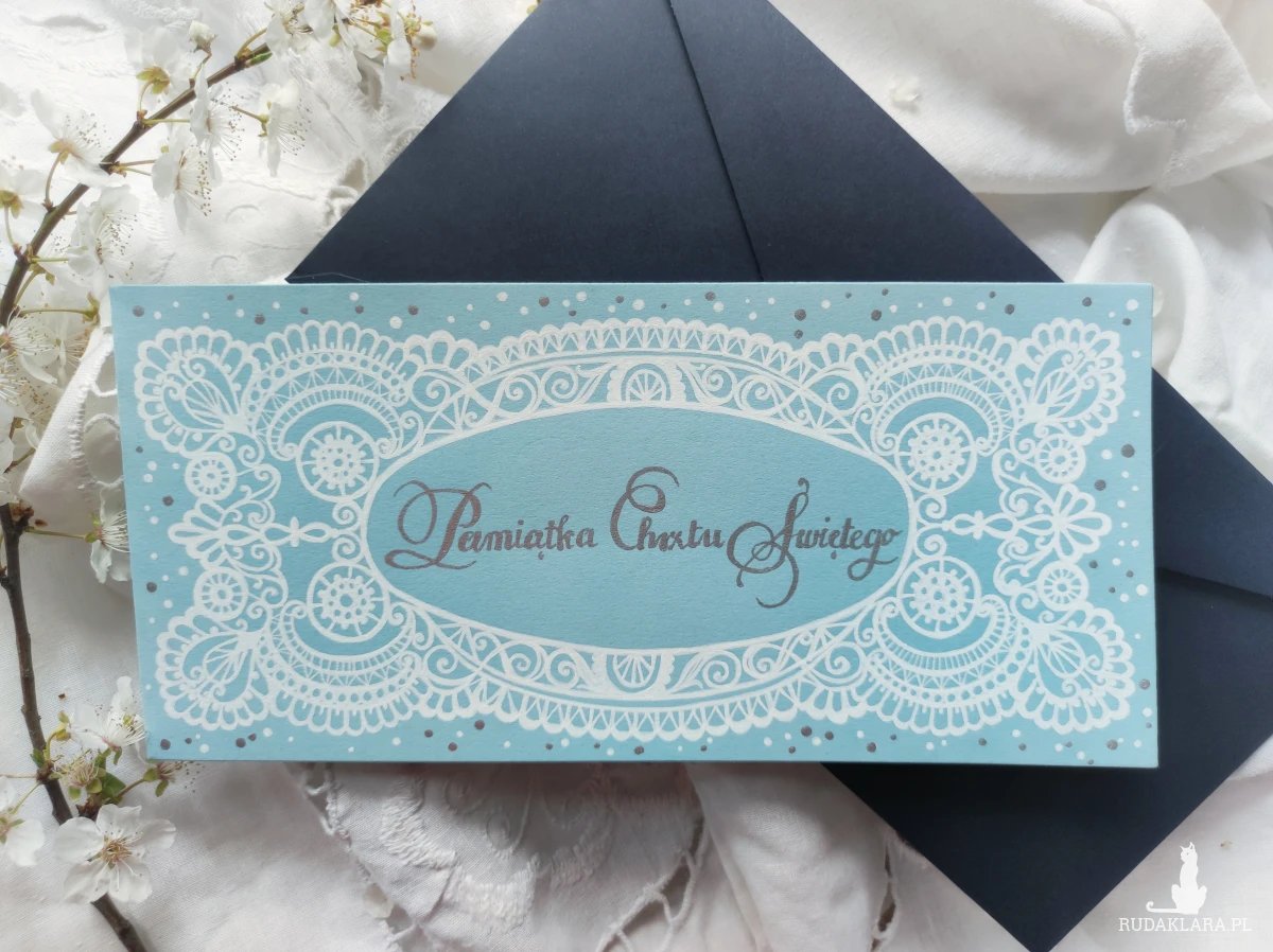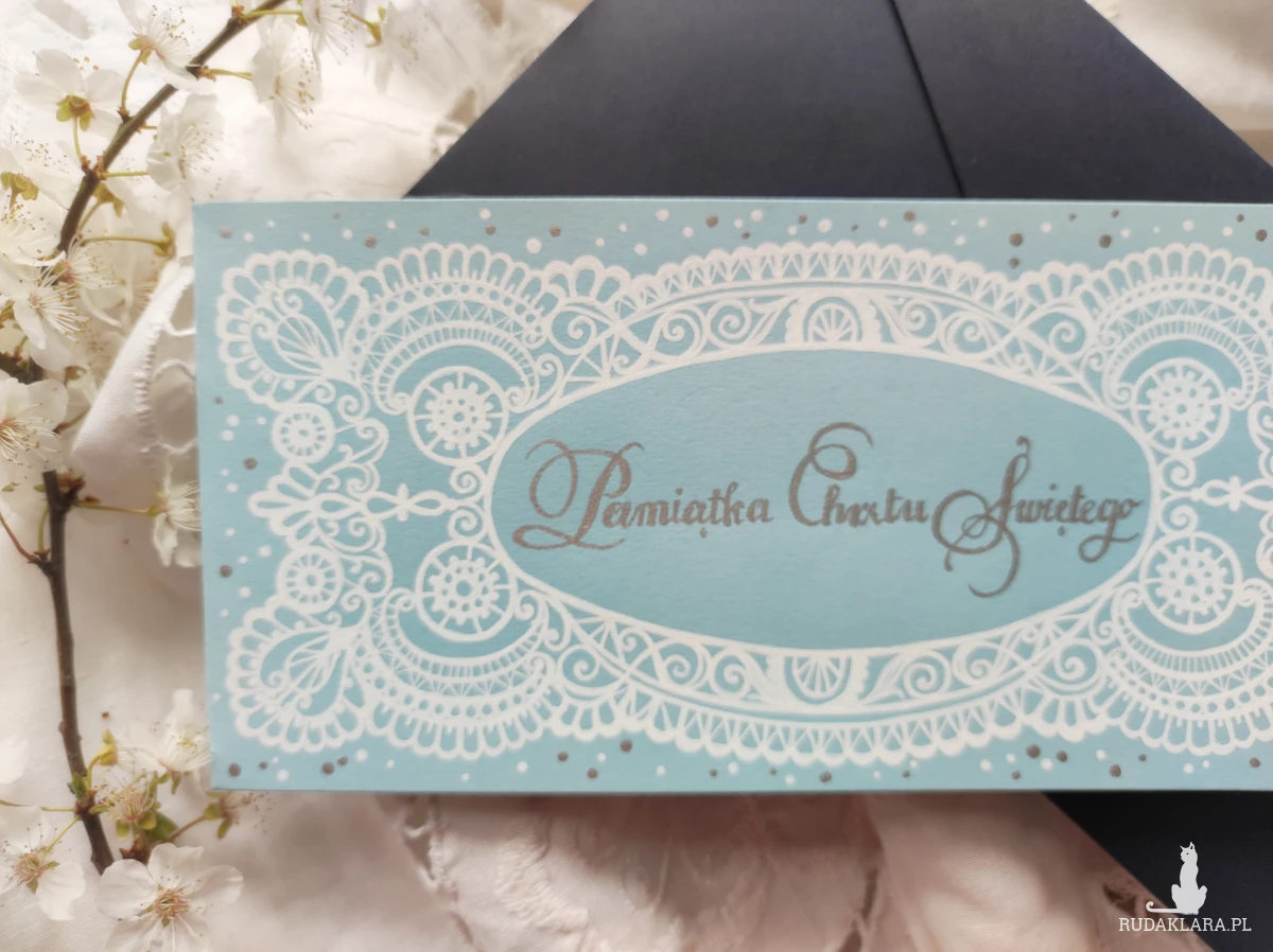 Pamiątka Chrztu Świętego z granatową kopertą.